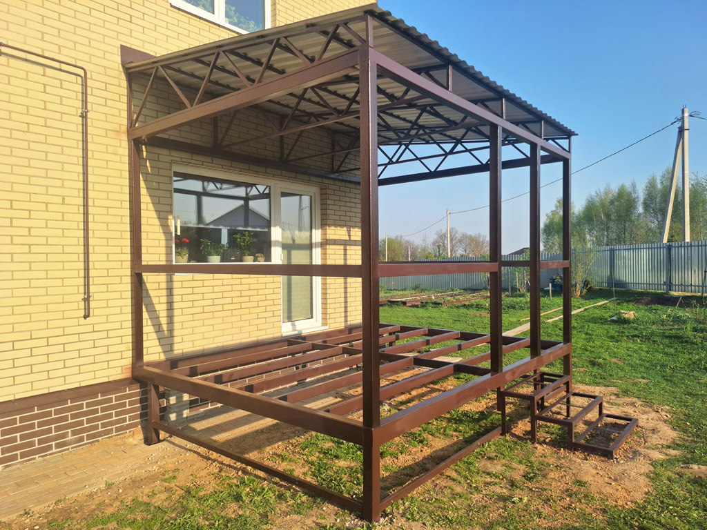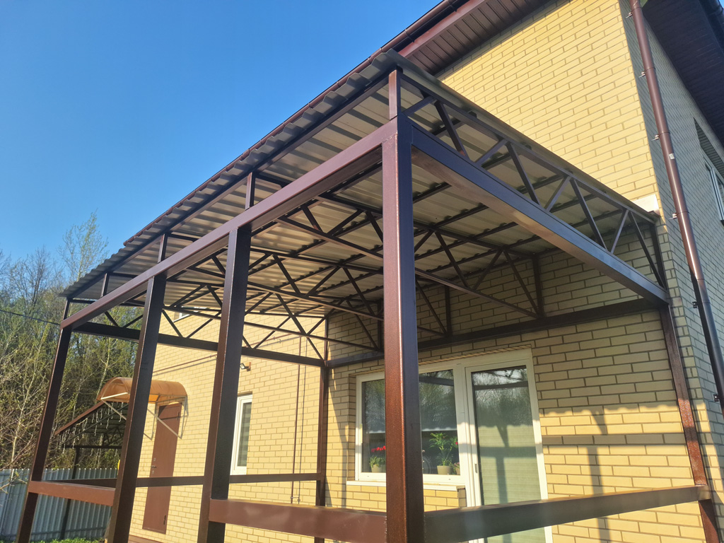 Изготовление и монтаж пристройки к дому на основе сварного металлического каркаса. Конструкция изготавливается на заказ с учётом всех предпочтений заказчика. Создание 3D-модели для согласования конструктива. Различные формы крыши и покрытия кровли: профлист, металлочерепица, гибкая черепица, сотовый и монолитный поликарбонат и пр. Работа по договору.
