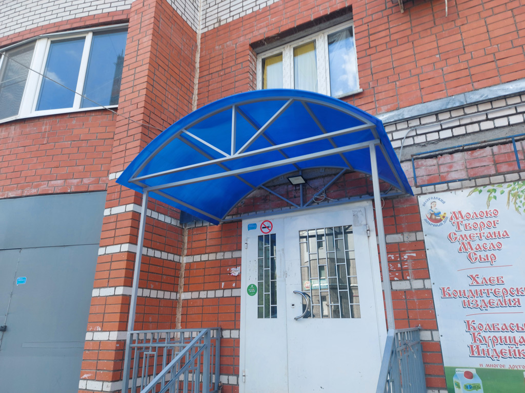 Размер козырька 1500х2500 мм. Поликарбонат толщиной 6 мм. синего цвета закреплён на каркасе в два слоя для лучшего сопротивления ударным нагрузкам. Каркас изготовлен из металлической профильной трубы сечением 40х25 мм. с толщиной стенки 2 мм. Стойки изготовлены из профильной трубы сечением 40х40 мм. Металл окрашен грунт-эмалью светло-серого цвета.