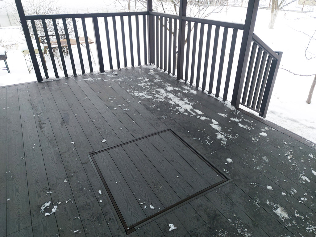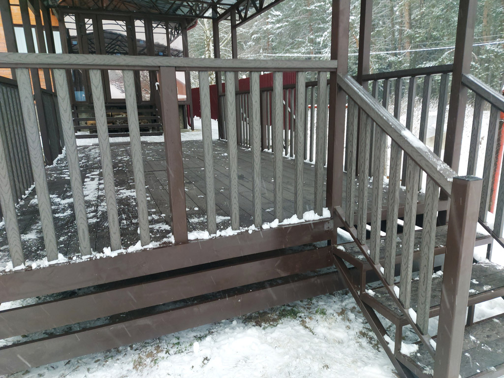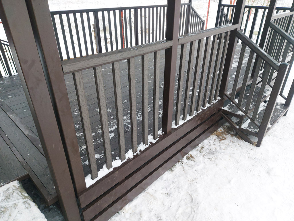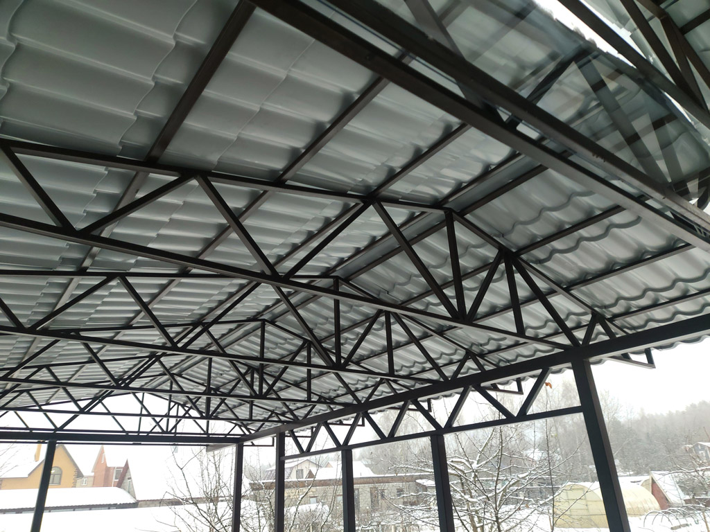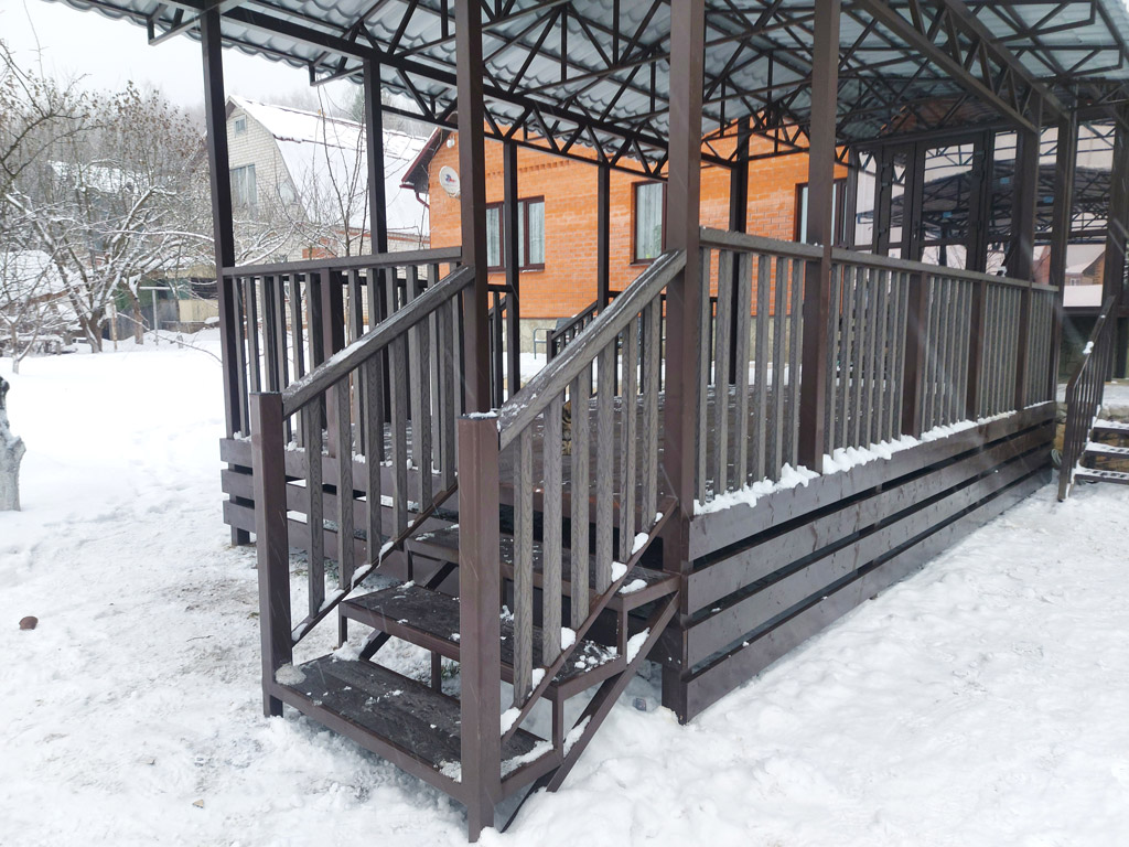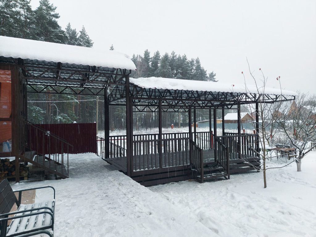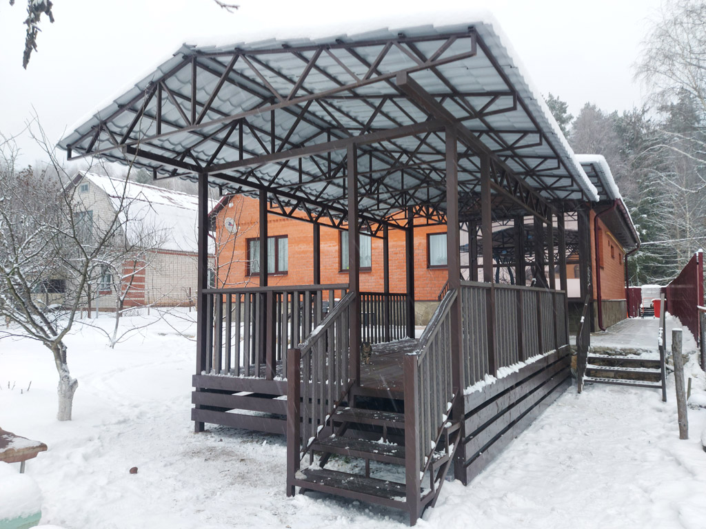 Изготовлена беседка размером 6000х3280 мм. (19 м²). Крыша состоит из семи ассиметричных ферм покрытых металлической черепицей. Беседка имеет две лестницы. Пол беседки и ступени лестниц обшиты доской ДПК. Перила изготовлены с использованием ДПК. В полу предусмотрен люк для обслуживания дренажного колодца. Фронтальная часть фермы примыкающая к входной группе зашита монолитным поликарбонатом для предотвращения падения снега у входа в дом. Цоколь беседки обшит крашеной струганной сосновой доской. Конструкция изготовлена с учётом последующего монтажа мягких окон.