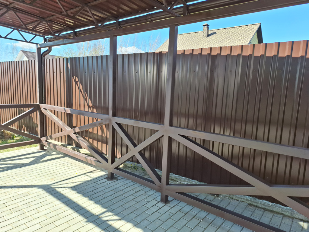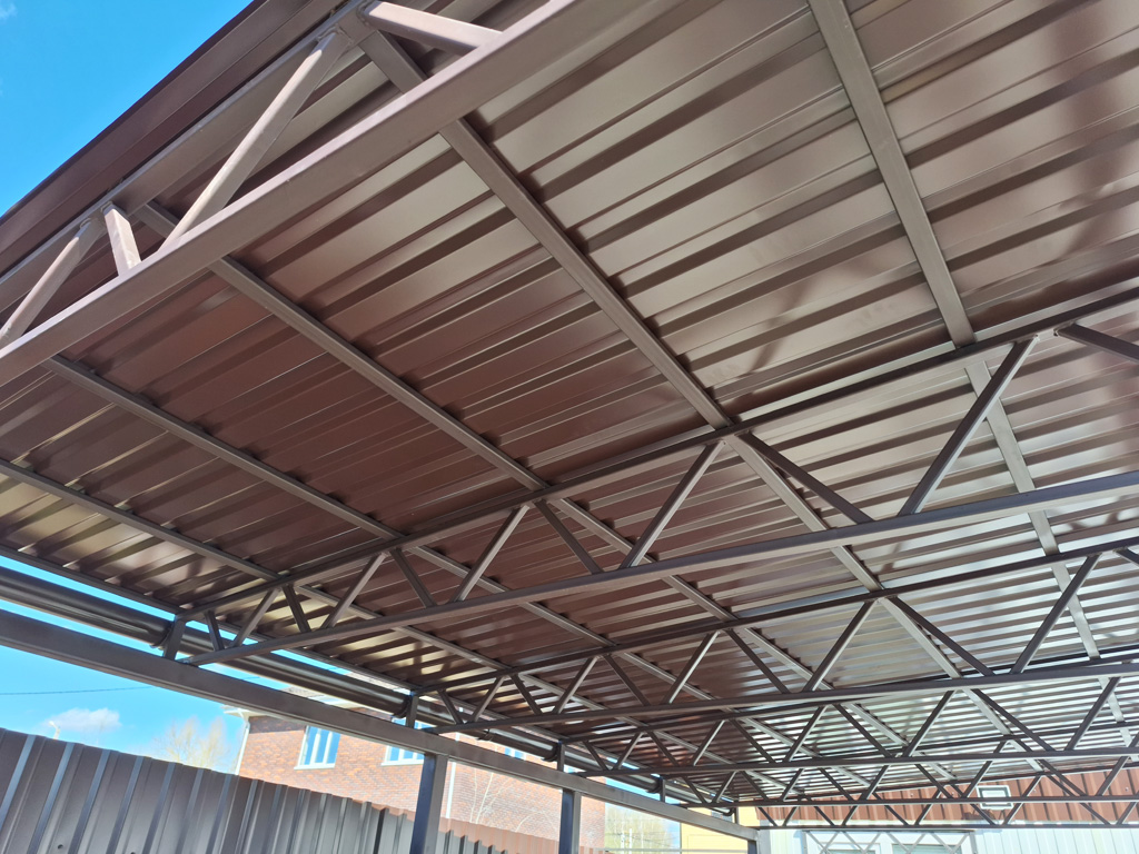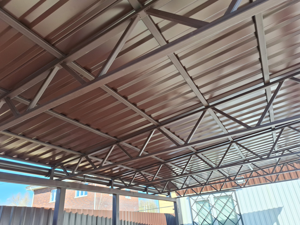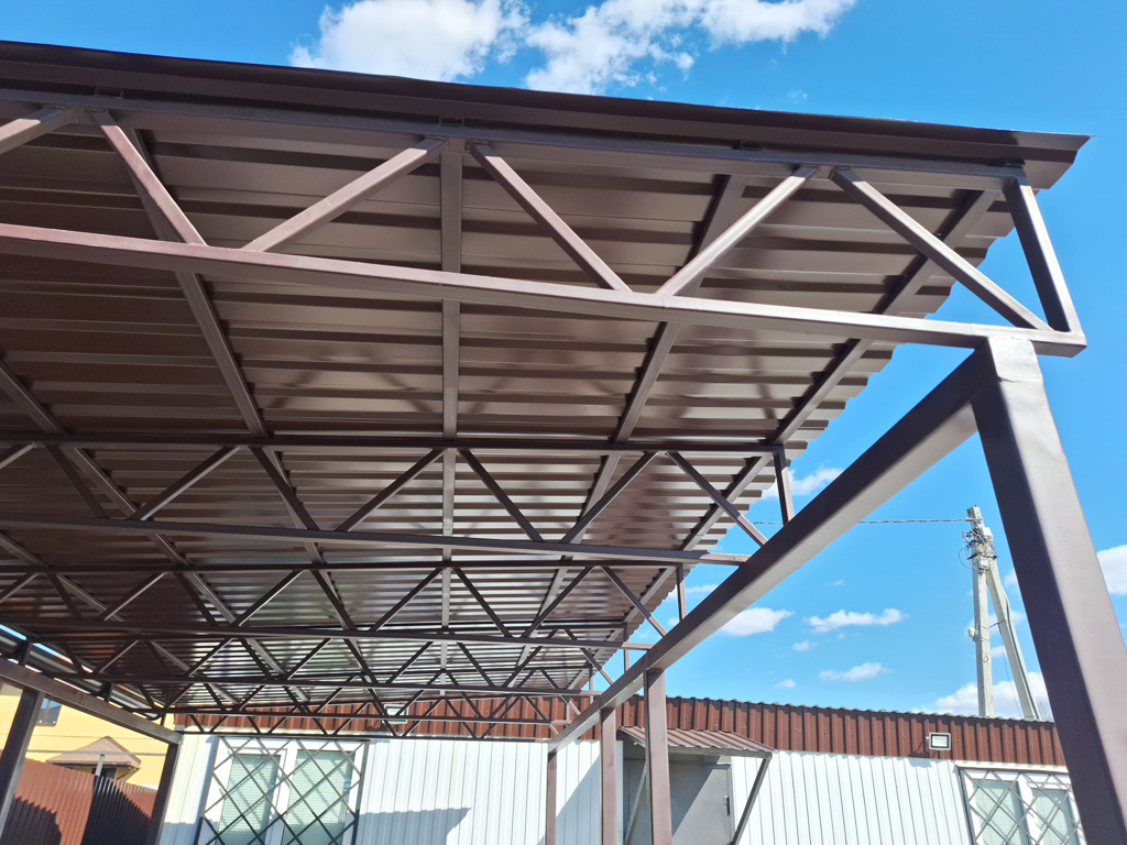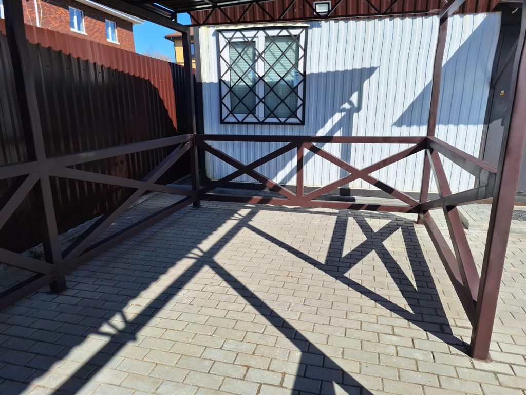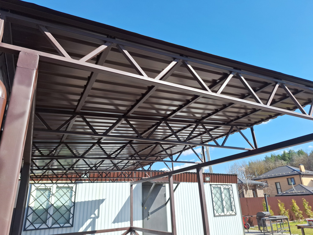 Общий размер беседки по столбам 6000х3000 мм. Покрывная площадь 18 м². Беседка имеет односкатную форму кровли с полезной высотой 2300 мм. Конструкция смонтирована на восемь опорных столбов, изготовленных из металлической профильной трубы сечением 80х80 мм. с толщиной стенки 3 мм. Столбы установлены в землю методом бетонирования на глубину 1200 мм. Верхние и нижние пояса ферм выполнены из металлической профильной трубы сечением 40х25 с толщиной стенки 2 мм. Обрешётка ферм изготовлена из металлической профильной трубы сечением 25х25х2 мм. Покрытие кровли реализовано с использованием металлического профильного листа, крашенного с двух сторон в коричневый цвет. Тип профильного листа - С-20 толщиной 0.4 мм. Ограждение беседки из металлической профильной трубы сечением 80х80 мм. Кровля оборудована водостоком.