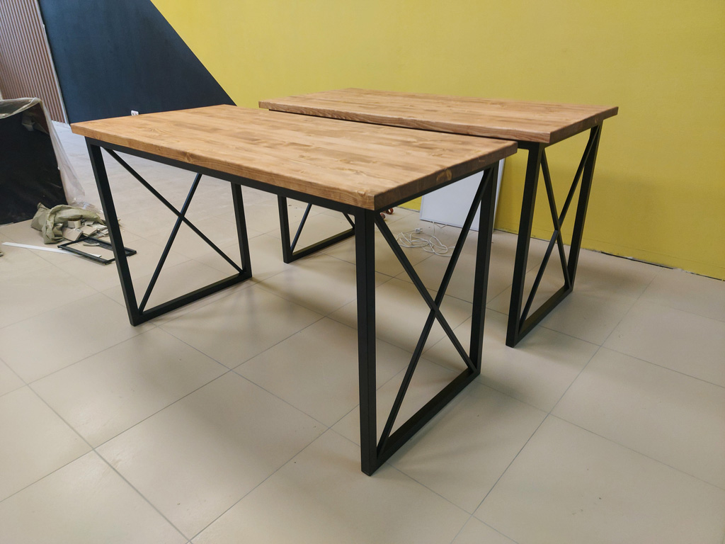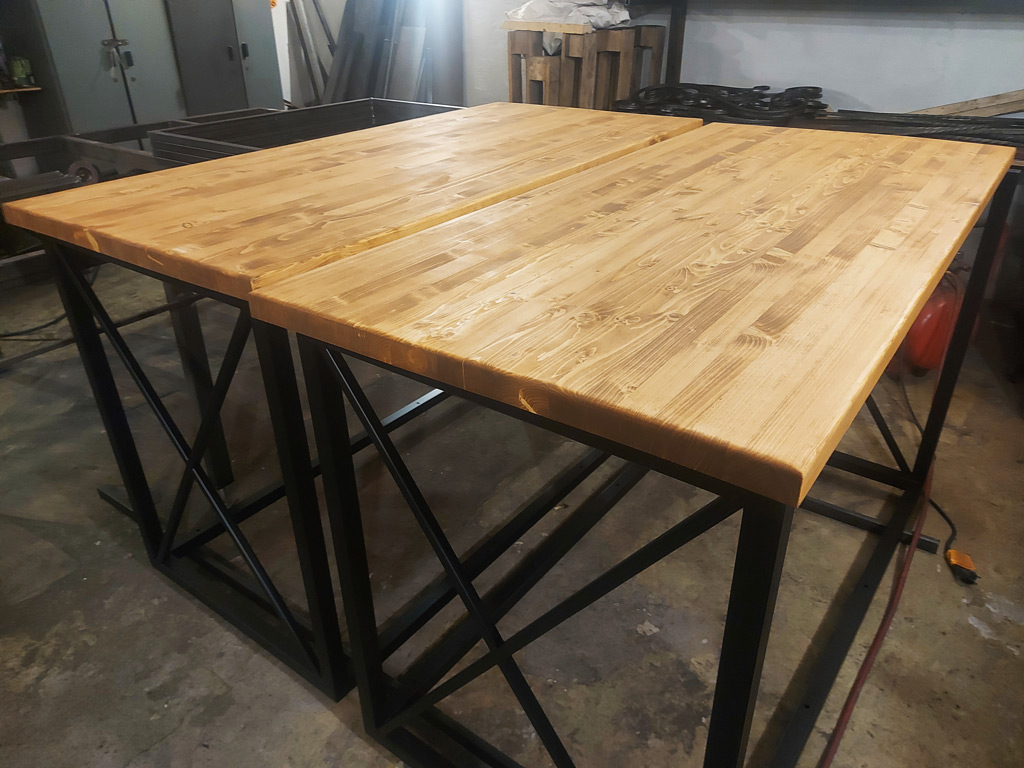Изготовлены два стола в стиле "Лофт" по размерам заказчика. Длина стола - 1700 мм., ширина 800 мм., высота 1000 мм. Столешница изготовлена из цельно ламельного соснового щита толщиной 40 мм. Столешница отфрезерована с четырёх сторон и покрыта маслом по дереву.