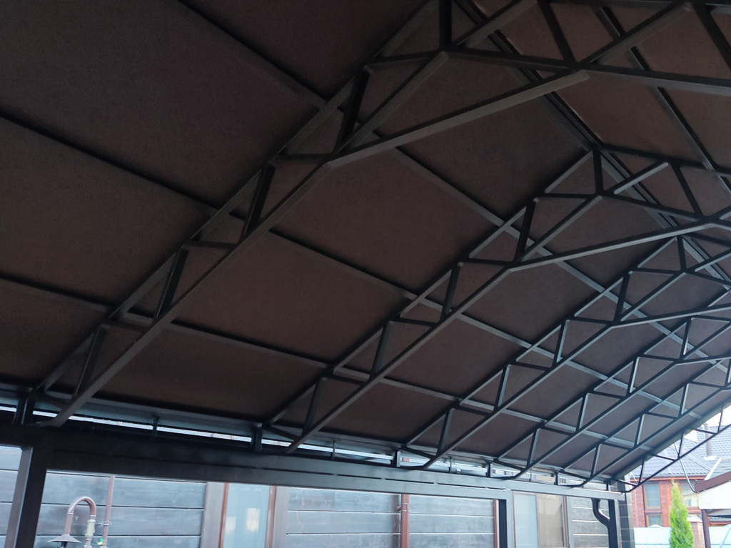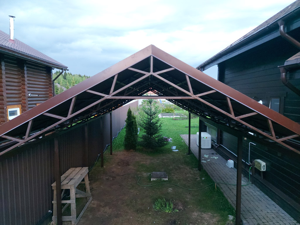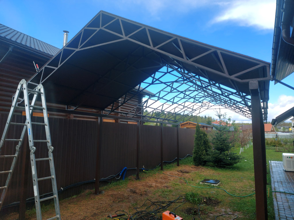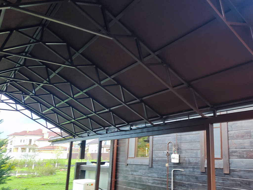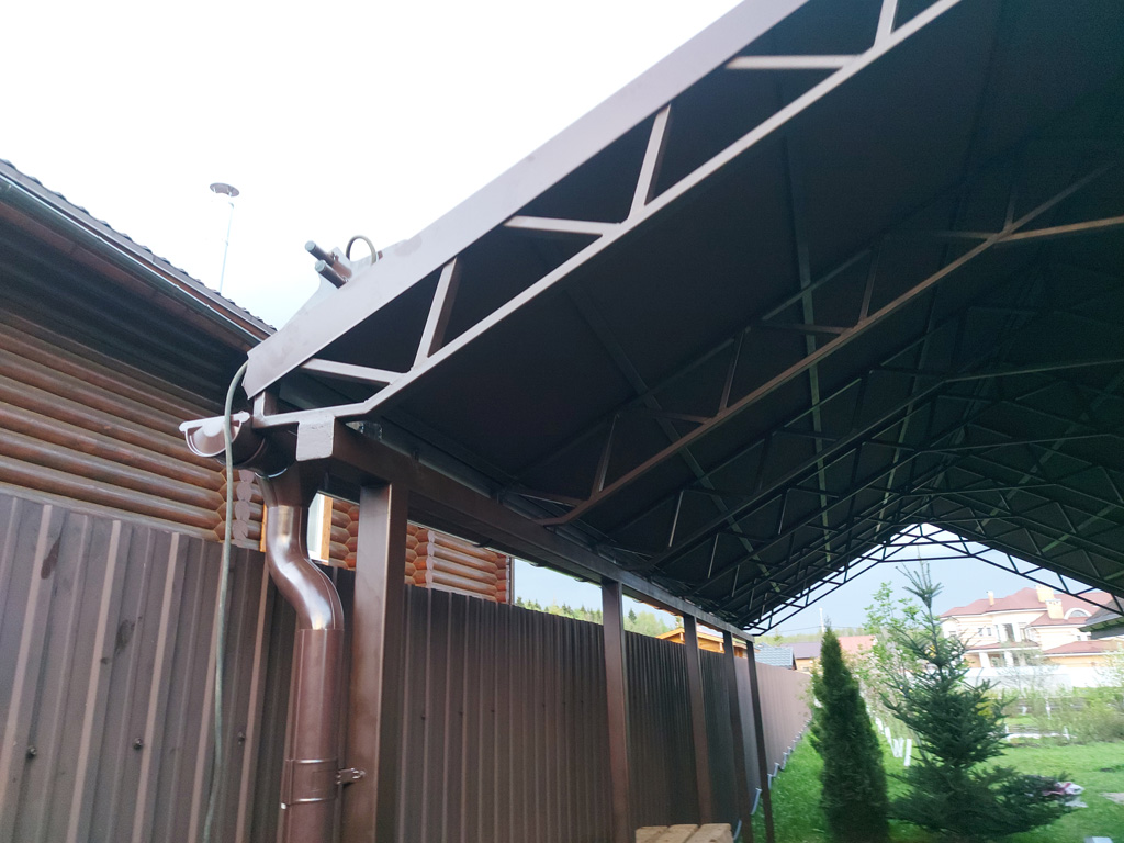 Покрывная площадь навеса по крыше 37.8 м². Размер навеса 8.8 х 4.3 метра. Для сооружения кровли изготовлены восемь несущих ферм треугольной формы. Опорные столбы из металлической профильной трубы 80х80 мм. с толщиной стенки 3 мм. установлены методом бетонирования. Покрытие крыши реализовано с использованием гибкой черепицы от производителя "Технониколь" серия "Фазенда". Основание крыши выполнено из листов OSB-3 толщиной 12 мм. с окраской защитным грунтом от производителя "Dali". Конструкция окрашена грунт-эмалью по металлу 3в1 в цвете "шоколад". Навес оснащён снегозадержателями и водостоками.