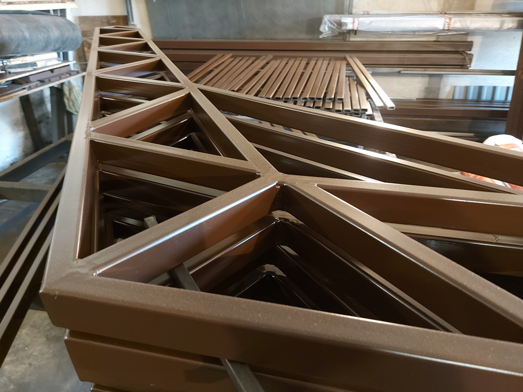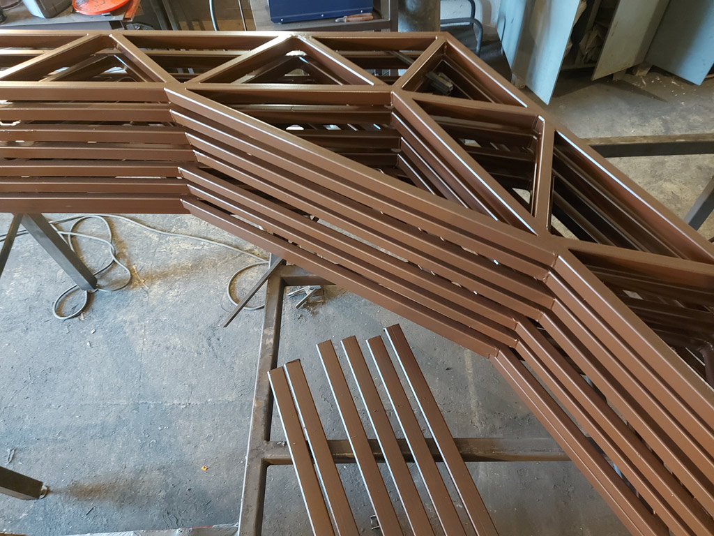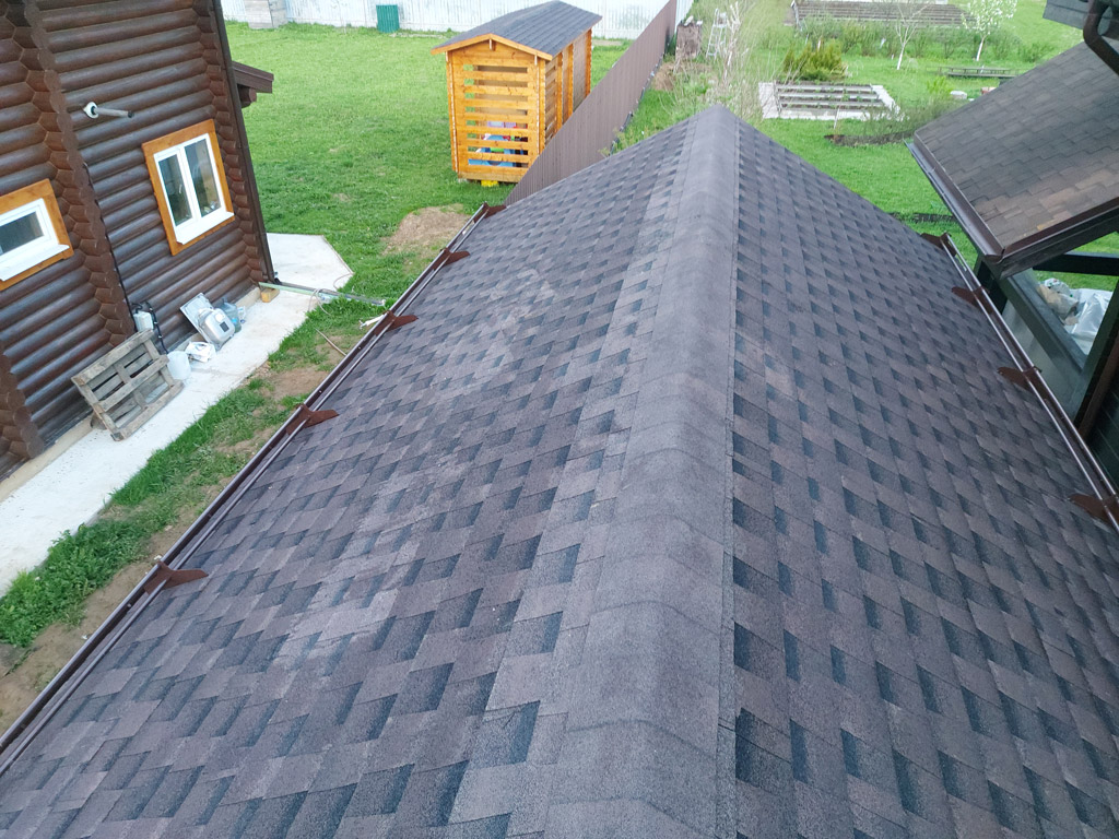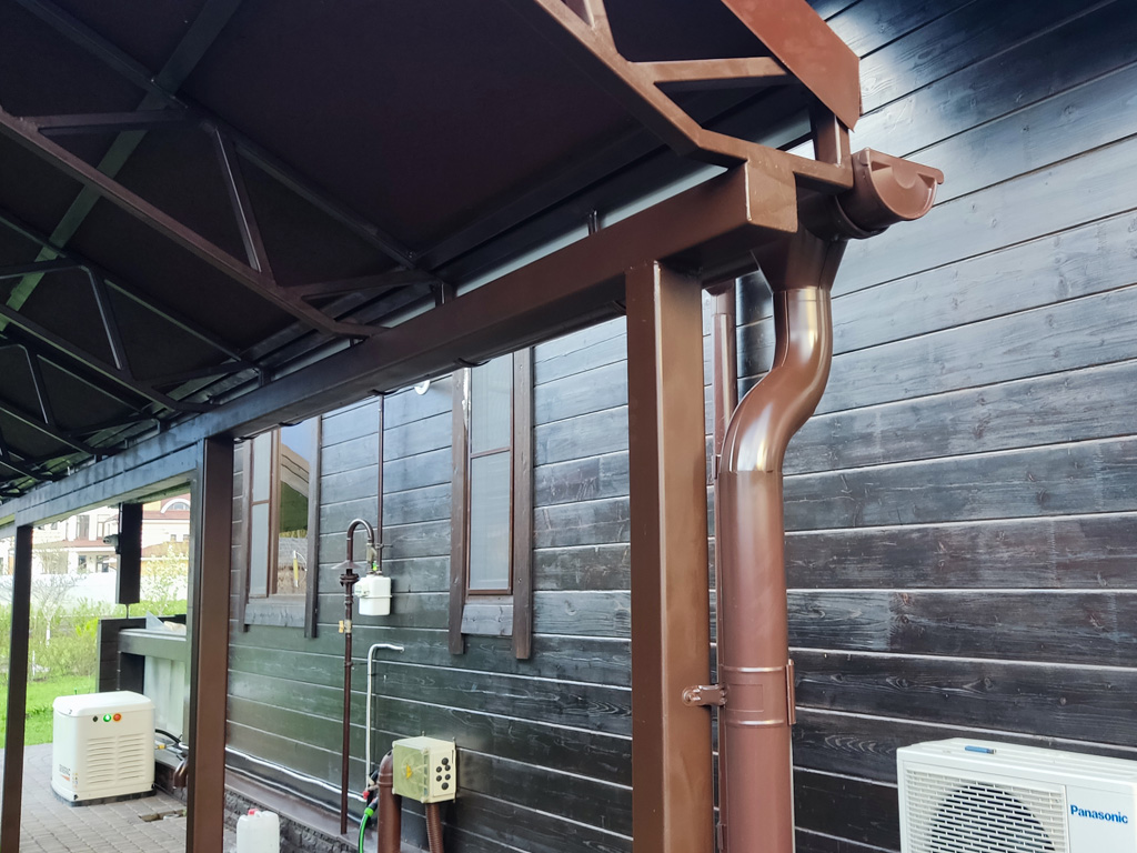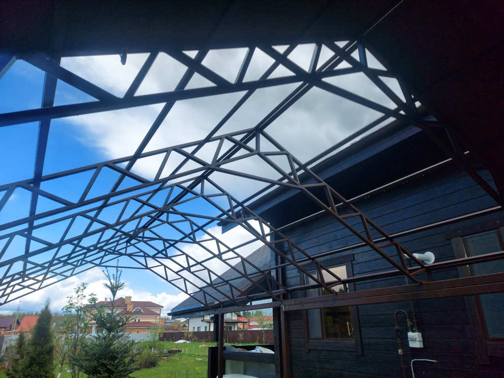 Покрывная площадь навеса по крыше 37.8 м². Размер навеса 8.8 х 4.3 метра. Для сооружения кровли изготовлены восемь несущих ферм треугольной формы. Опорные столбы из металлической профильной трубы 80х80 мм. с толщиной стенки 3 мм. установлены методом бетонирования. Покрытие крыши реализовано с использованием гибкой черепицы от производителя "Технониколь" серия "Фазенда". Основание крыши выполнено из листов OSB-3 толщиной 12 мм. с окраской защитным грунтом от производителя "Dali". Конструкция окрашена грунт-эмалью по металлу 3в1 в цвете "шоколад". Навес оснащён снегозадержателями и водостоками.