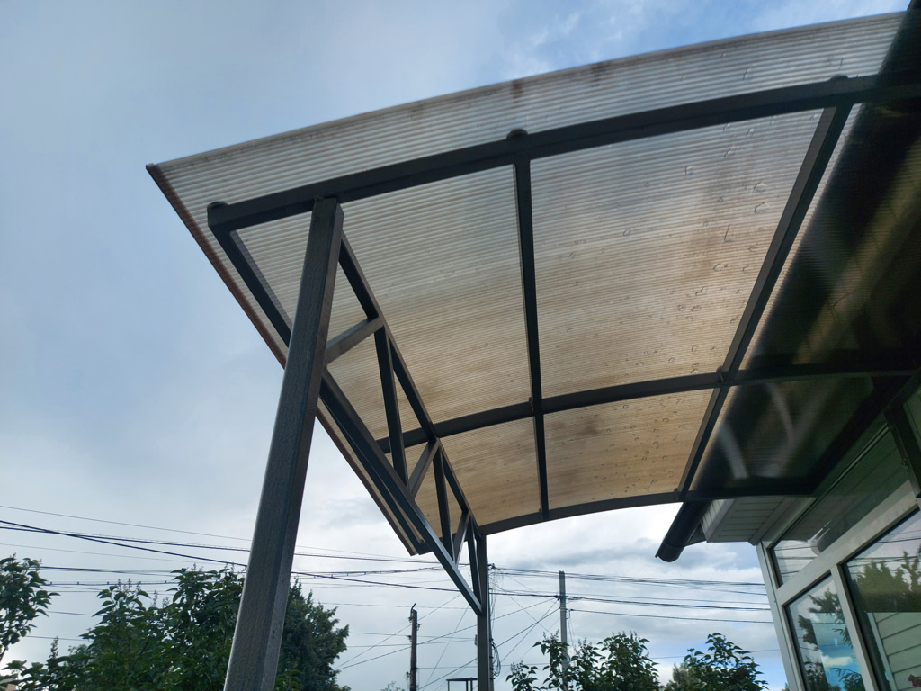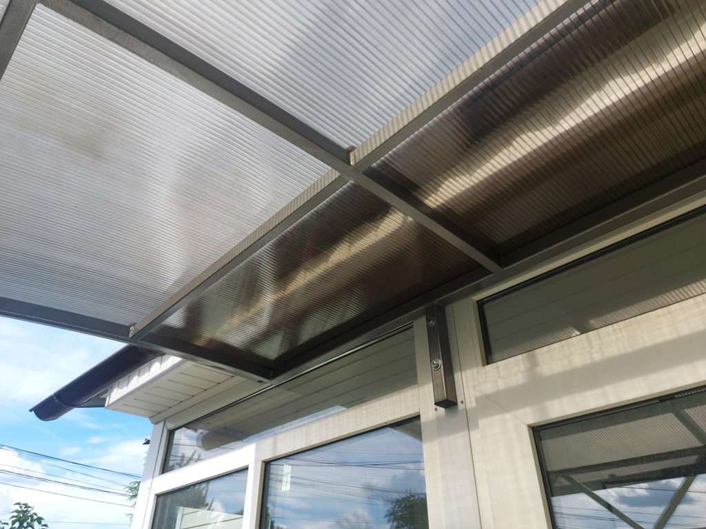 Размер козырька 2000х1500 мм. Конструкция изготовлена из металлических профильных труб сечением 40х40 мм. (стойки), 25х25 мм. (ферма), 40х25 мм. (каркас). Толщина металла 2 мм. Покрытие козырька из сотового поликарбоната "Полигаль" толщиной 8 мм. в цвете "бронза". Монтаж каркаса к фасаду пристройки выполнен на болтах. Использована краска "Dali", с молотковым эффектом, цвет "серебристый". Форма крыши козырька - полуарка.