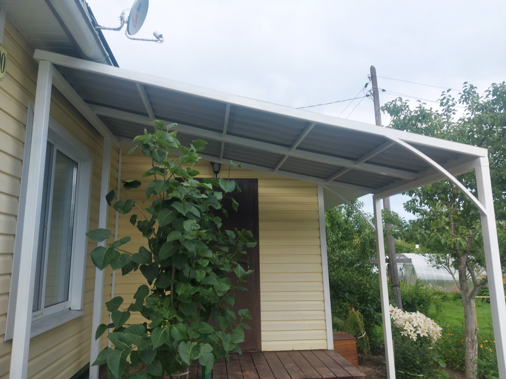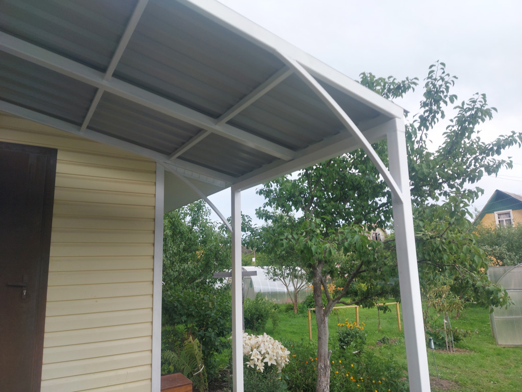 Смонтирован козырёк над входом в дачный дом. Размер покрывной площади 3000х1600 мм. Конструкция на четырёх опорных столбах без привязки к дому. Обрешётка крыши изготовлена их металлической профильной трубы сечением 60х30 мм. с толщиной стенки 3 мм. и профильной трубы сечением 40х25 мм. с толщиной стенки 1.5 мм. Опорные столбы имеют сечение профиля 60х60 мм., установлены методом "бутования". Покрытие из профильного листа толщиной 0.4 мм., крашенного с лицевой стороны. Металлический каркас окрашен в два слоя, цвет - белый.