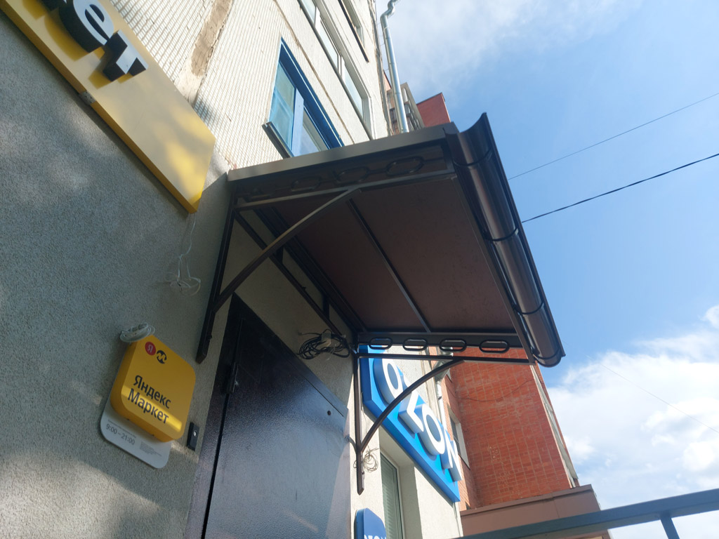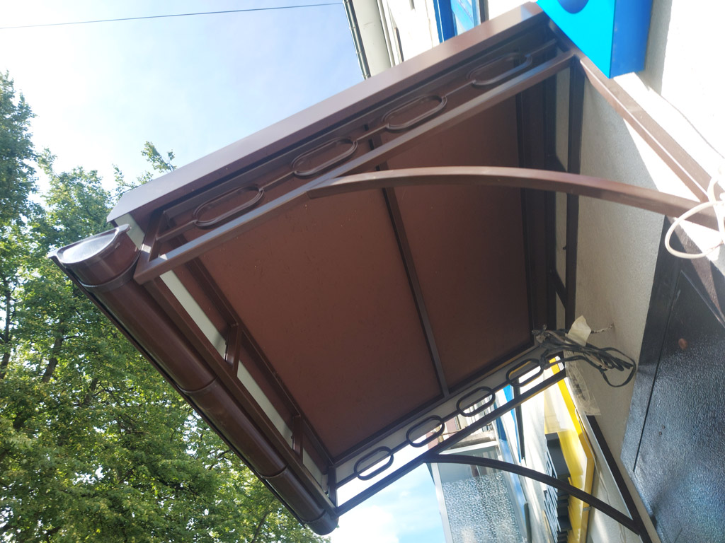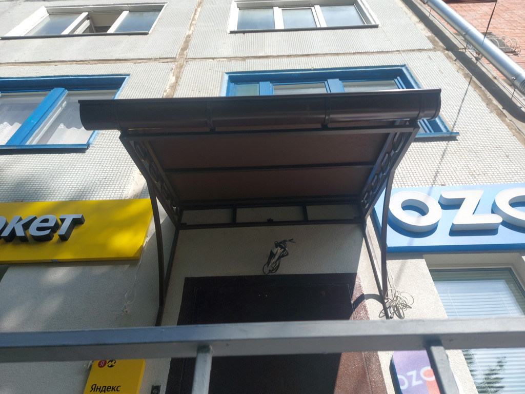 Козырёк над входом на сварном металлическом каркасе с покрытием мягкой кровлей и водостоком. Ширина козырька по стороне примыкания к фасаду здания 1300 мм. Вылет козырька 1000 мм. Гибкая черепица уложена на основание из панели OSB толщиной 12 мм. с использованием подкладочного ковра.