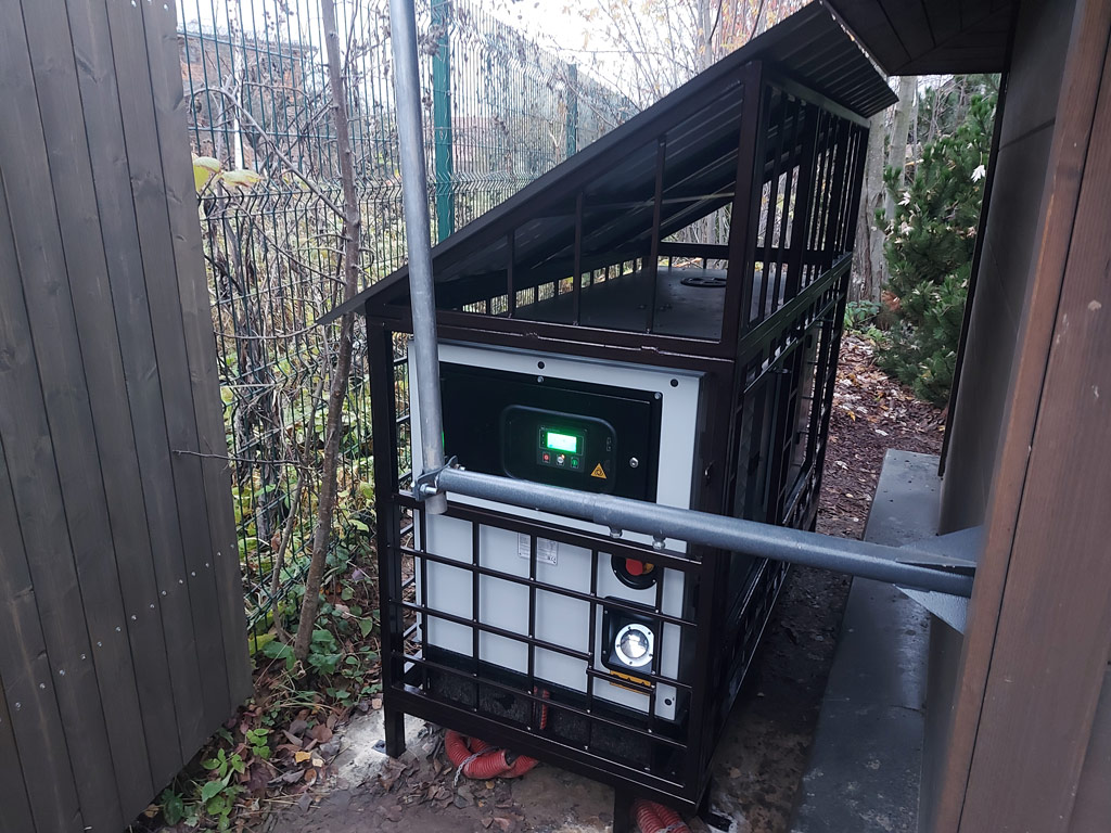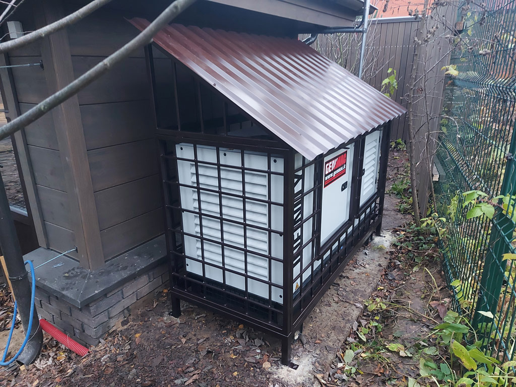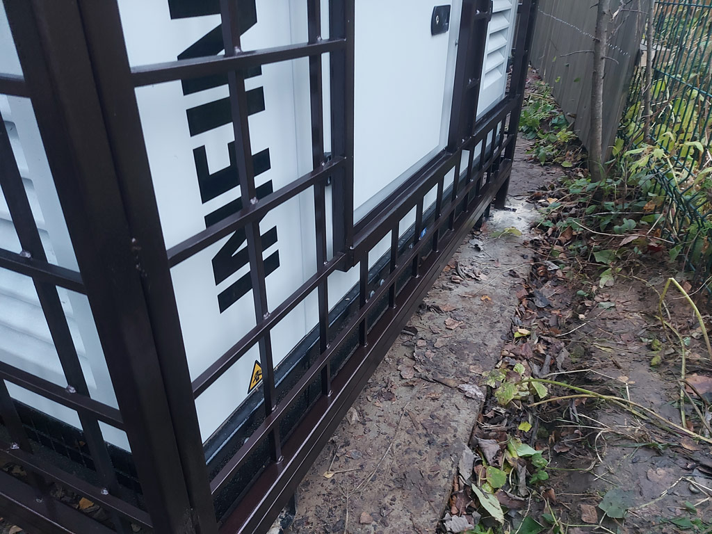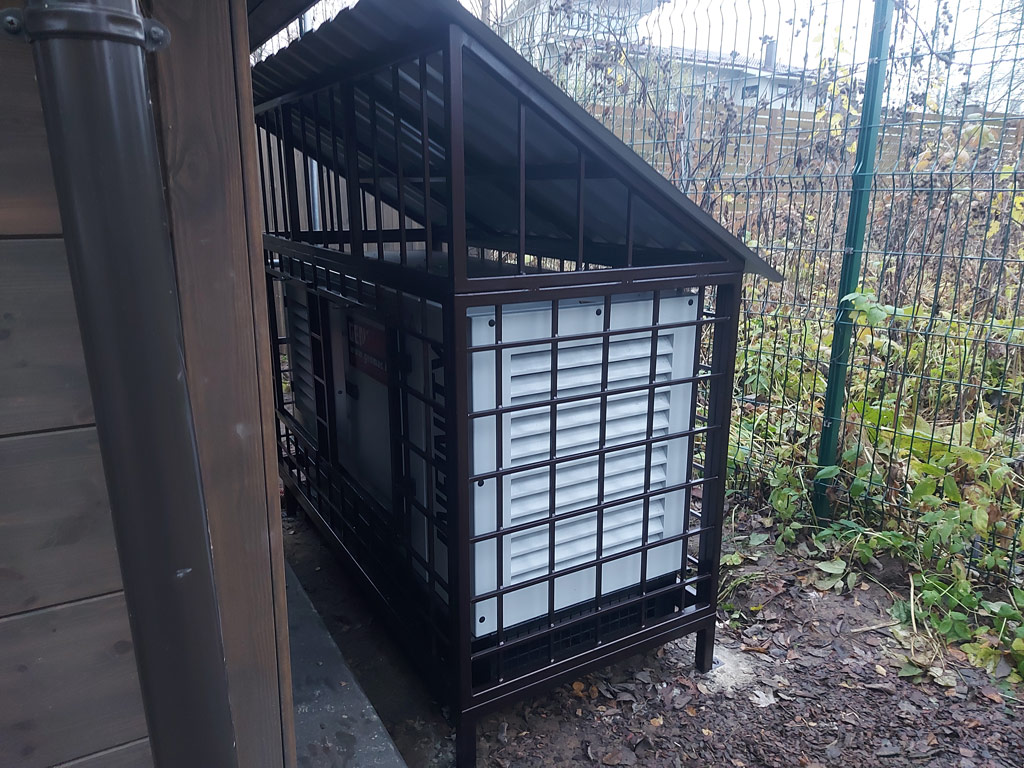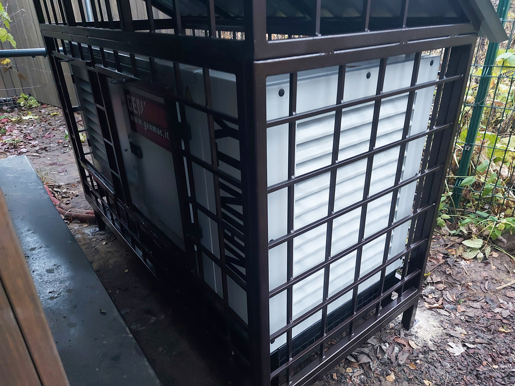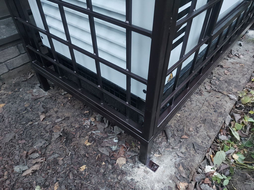 Сварная металлическая защитная решётка для генератора с четырьмя съёмными створками для обслуживания. Ширина изделия 840 мм., длина 1920 мм., высота по нижней точке 1150 мм. В работе использован полнотелый металлический пруток сечением 12 мм. Створки закрываются на навесные замки. Окраска - эмаль по металлу с молотковым эффектом в цвете "шоколад" в два слоя. Решётка закреплена к бетонной площадке на арматуру.