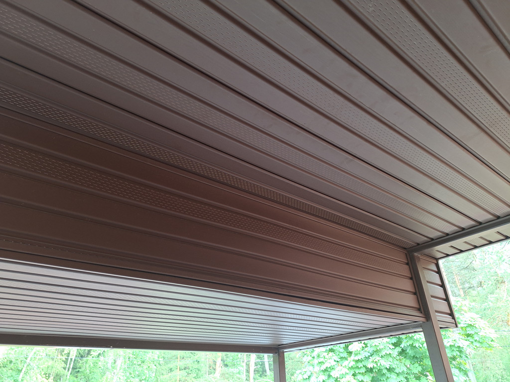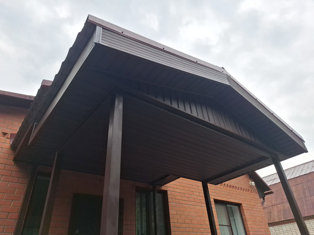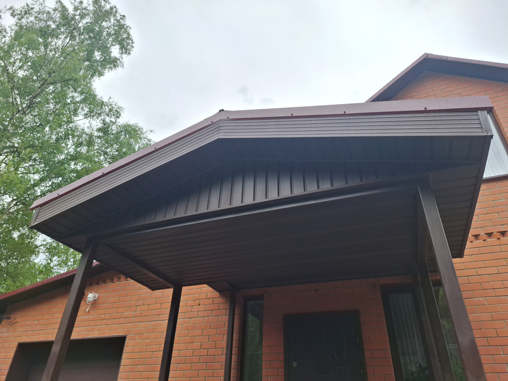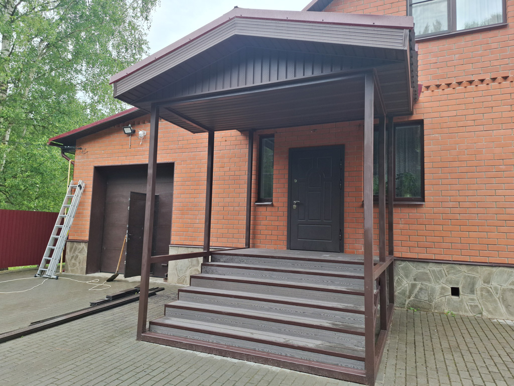 Металлический каркас площадки и ступени входной группы изготовлены из профильной трубы 40х20х2 мм. и 30х15х1.5 мм. Обшивка каркаса выполнена доской ДПК от производителя «Grand Line» шириной 140 мм. с тиснением под дерево в цвете «Венге». Общая площадь обшитого каркаса доской ДПК 10 м². Двускатный козырёк каскадного типа покрыт металлочерепицей в цвете «Красное вино». Общий размер козырька 3000х3300 мм. Столбы и несущие элементы козырька изготовлены из профильной трубы сечением 80х80 мм. с толщиной стенки 3 мм. Козырёк с внутренней стороны подшит софитами в цвете «шоколад», которые смонтированы на обрешётку из доски. Доска обрешётки покрыта защитной пропиткой от гниения. Каркас входной группы изготовлен с учётом последующего остекления конструкции окнами ПВХ.