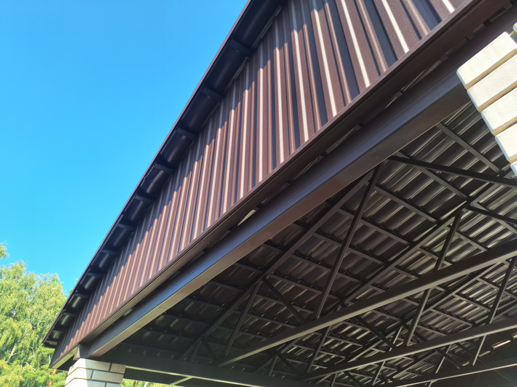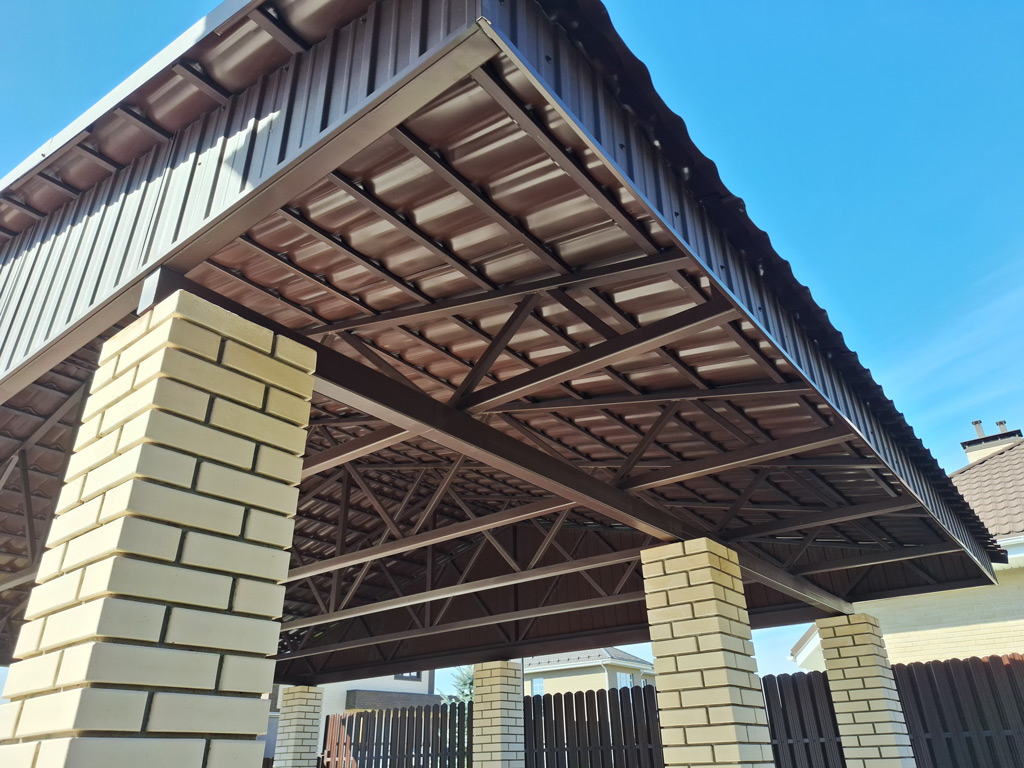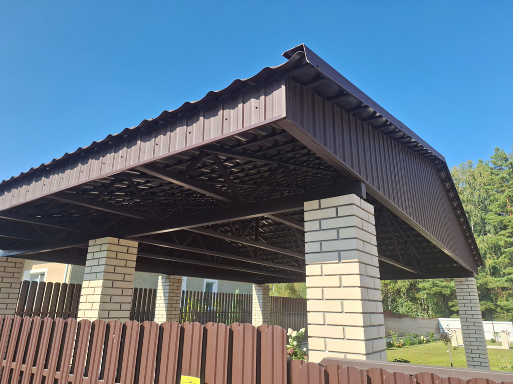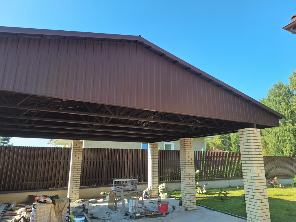 Изготовлен сварной металлический навес с двухскатной формой кровли покрытый металлочерепицей. Конструкция смонтирована на существующие столбы заказчика. Общий размер покрывной площади 66 м². Ширина навеса 9 400 мм. Длина 7 000 мм. В работе использована металлочерепица от производителя «Grand Line» серии «Классик» с покрытием «Velur Х» в цвете RAL 8017 (коричневый) с матовой поверхностью. Торцевые фермы и торцы ферм навеса с внешней стороны зашиты металлическим профильным листом от производителя «Grand Line» с покрытием «Velur Х». На обвязку навеса выполненную с использованием металлической профильной трубы сечением 120х80 мм. с толщиной стенки 4 мм. шесть ферм монтировались с использованием манипулятора. Навес предназначен для парковки двух автомобилей с дополнительной покрывной площадью для защиты площадки от снега и осадков.