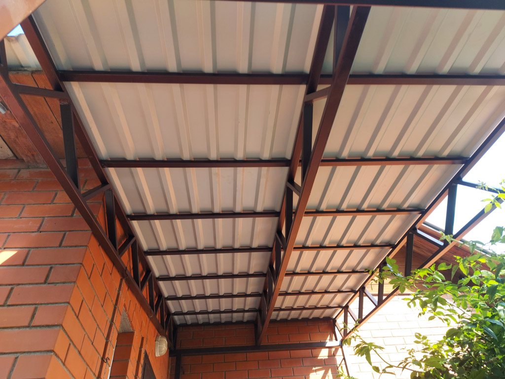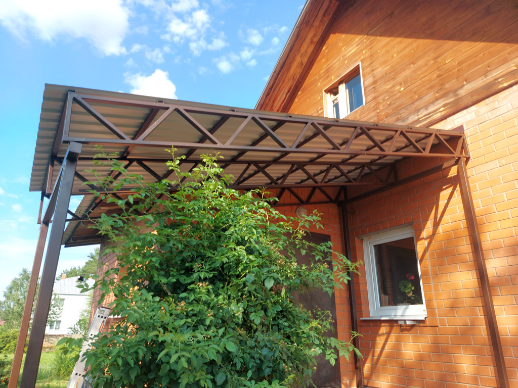 Размер покрывной площади навеса 4200х2000 мм. Конструкция смонтирована на 4 опорных столбах 60х60х3 мм. установленных методом "бутования". Три опорные фермы крыши изготовлены из профильной трубы 40х25х2 мм. Обрешётка крыши из профильной трубы 40х20х1.5 мм. Использован профлист тип С-20 толщиной 0.4 мм. Окраска металлического каркаса выполнена грунт-эмалью по металлу в коричневый цвет. Конструкция закреплена к дому прутками из арматуры.