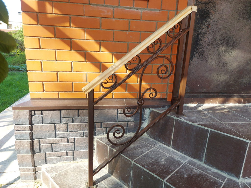 Изготовлены и установлены перила. Длина 1250 мм., высота 900 мм. Перила оборудованы деревянным поручнем. В качестве декоров использованы холодногнутые элементы.
