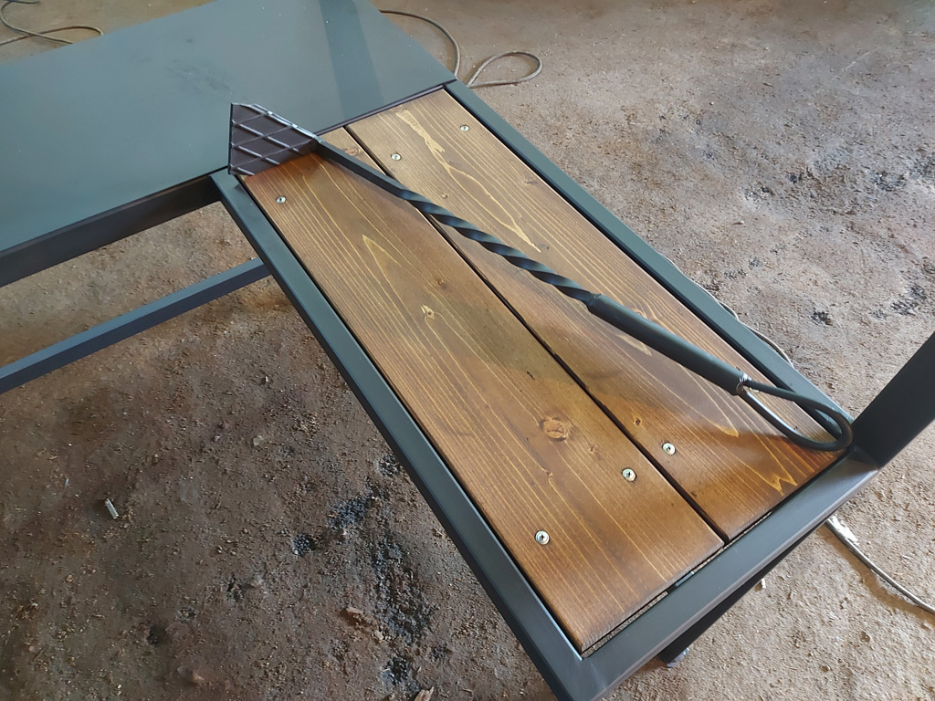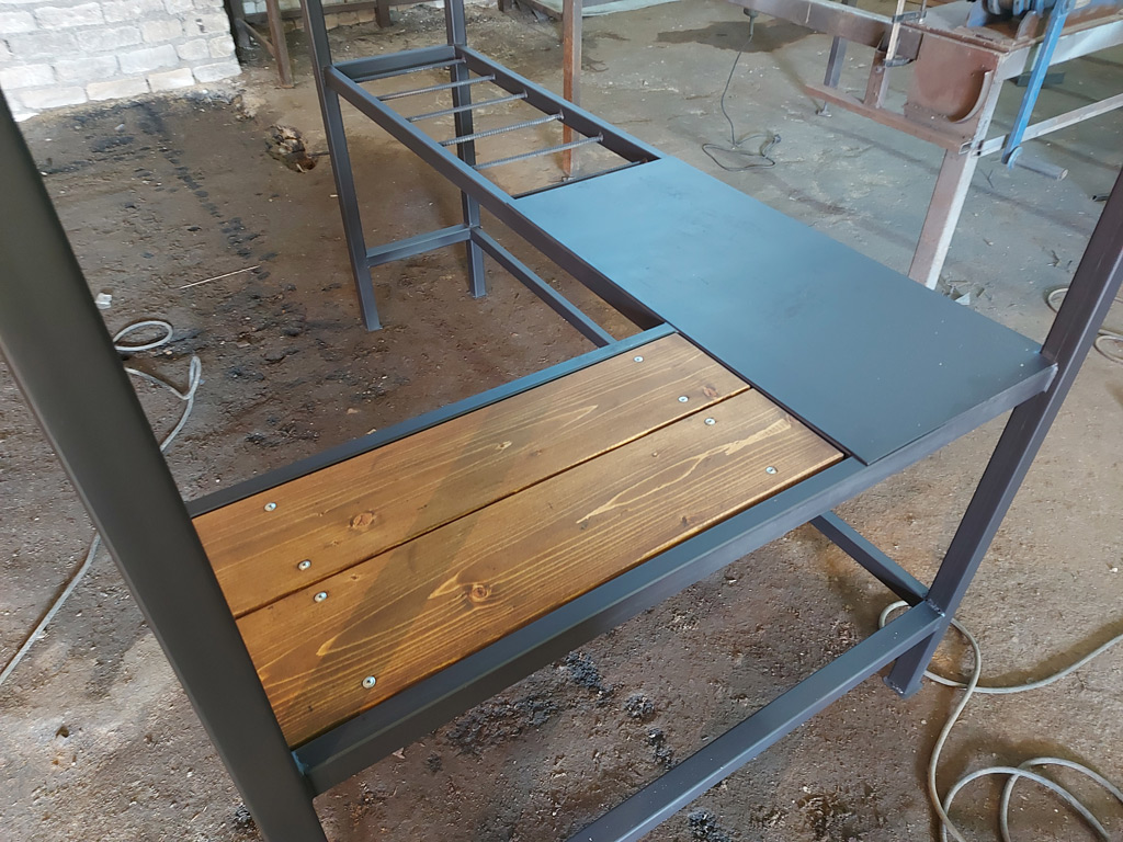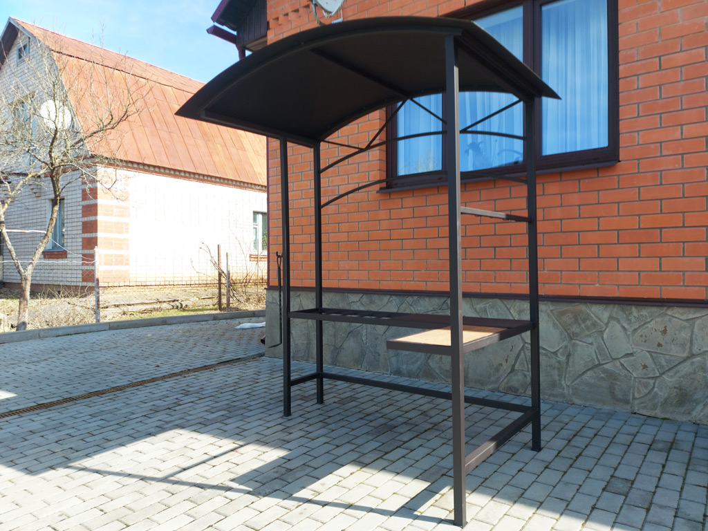 Изготовлен навес для мангальной зоны с деревянной и металлической столешницей. Конструкция предназначена для установки мангала. Размер покрывной площади 1250х1800 мм. Высота 2100 мм. Использована металлическая профильная труба 40х40х2 мм., 40х25х2 мм., 30х30х2 мм. и 20х20х2 мм. Крыша покрыта холоднокатаным металлическим листом толщиной 1.5 мм. Металл покрашен термостойкой краской Certa 1200°C.