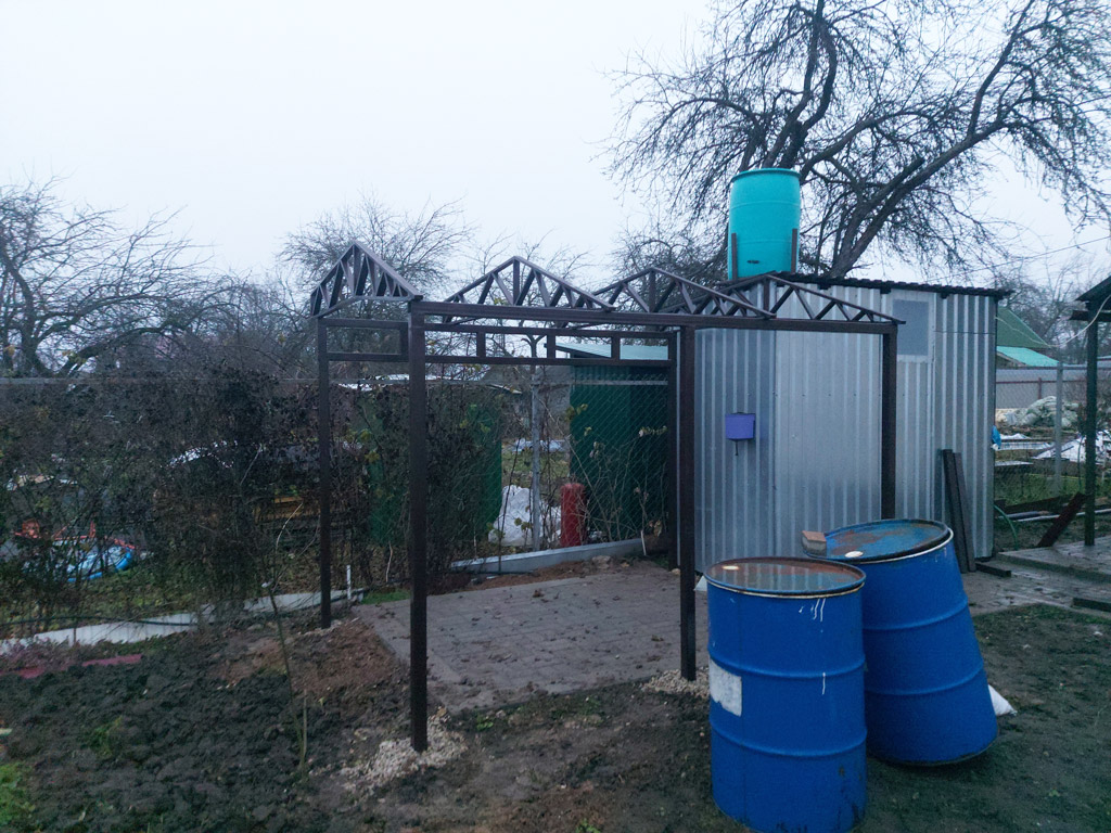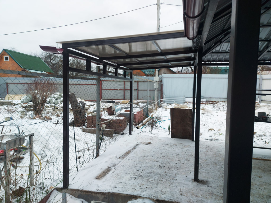 Изготовлен и смонтирован односкатный навес с покрытием из поликарбонта высокой плотности (толщина плиты 8 мм., вес 1500 г/м²). С одной стороны столбы закреплены анкерами в бетонную площадку. Навес примыкает к металлоконструкции используя её опорные столбы. Произведён монтаж водосточного желоба. Размер навеса 3200х1750 мм. Столбы изготовлены из металлической профильной трубы 60х60х3 мм. Второй навес изготовлен в двухскатном исполнении с примыканием к сараю. Столбы установлены методом бутования. В качестве покрытия используется профнастил толщиной 0.4 мм. в цвете "вишня". Каркасы обоих навесов покрашены в коричневый цвет.