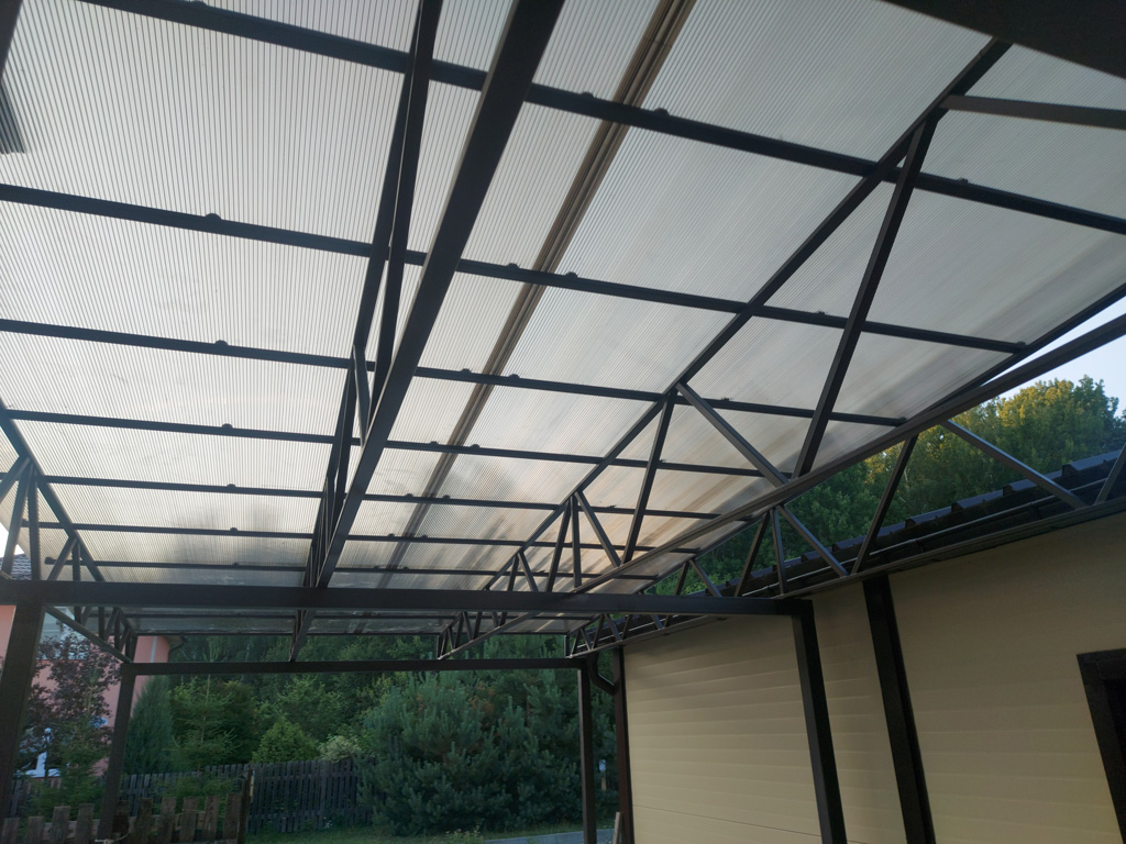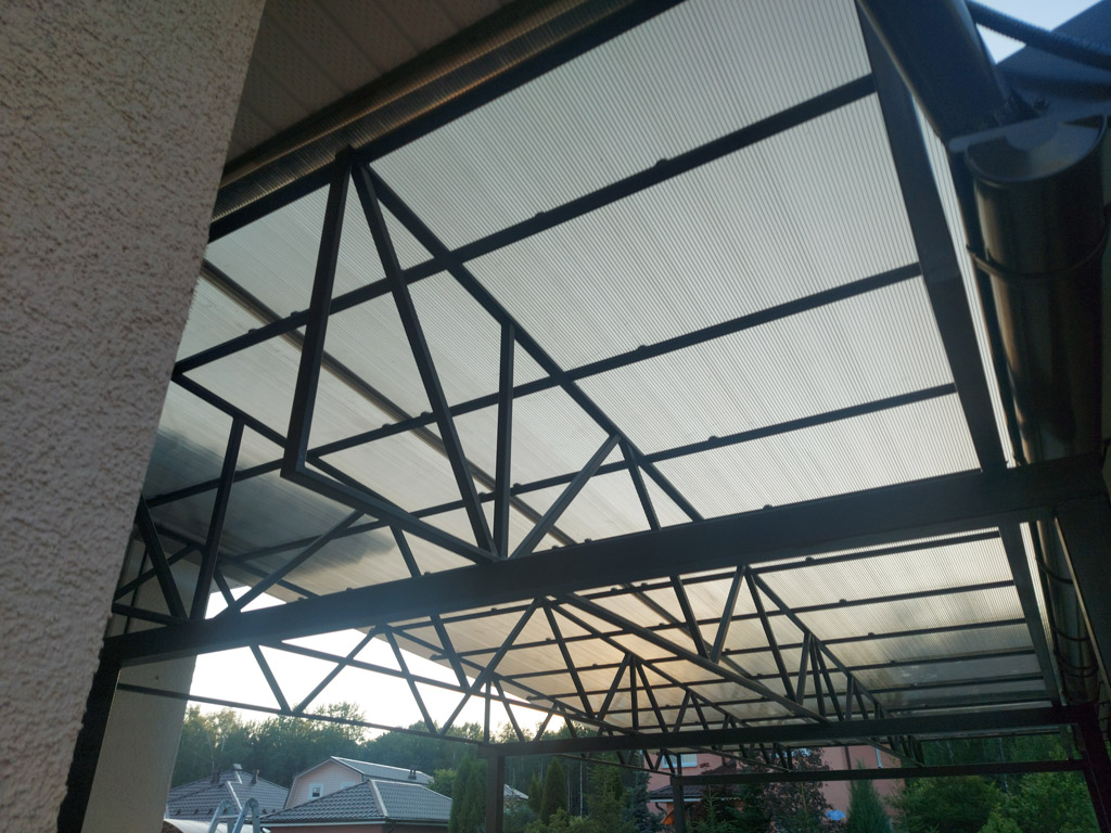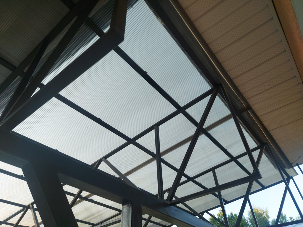 Монтаж кровли навеса осуществлён на существующие столбы. Размер навеса по крыше 7000х3410 мм. Кровля состоит из четырёх односкатных ферм длиной 7000 мм. Кровля покрыта сотовым поликарбонатом от производителя «Полигаль», серия «Стандарт». Толщина сотового поликарбоната - 8 мм., цвет – «бронза». Верхние и нижние пояса ферм изготовлены из металлической профильной трубы 40х20х2 мм. Обрешётка ферм из металлической профильной трубы 30х30х2 мм.