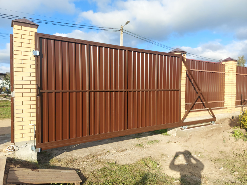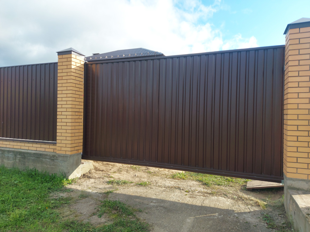 Ширина рабочего проёма откатных ворот 4000 мм. Высота полотна 2250 мм. Каркас изготовлен из металлической профильной трубы сечением 60х40 и 40х20 мм. с толщиной стенки 2 мм. Ворота обшиты профильным листом типа С-20, крашенным с двух сторон в цвет «шоколад». Основание выполнено из 1 м3 бетона марки М300 (B22,5) на гравии. Размер бетонного основания: длина 2000 мм., ширина 400 мм., глубина 1200 мм. Закладная изготовлена из металлического швеллера 12П с использованием арматуры сечением 12 мм. Монтаж реализован с набором комплектующих (ролики, уловители и пр.) от производителя «DoorHan». Металл окрашен в два слоя: грунт + эмаль по металлу.