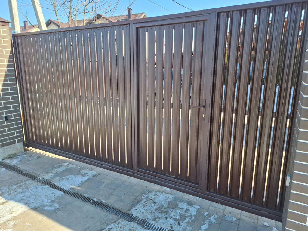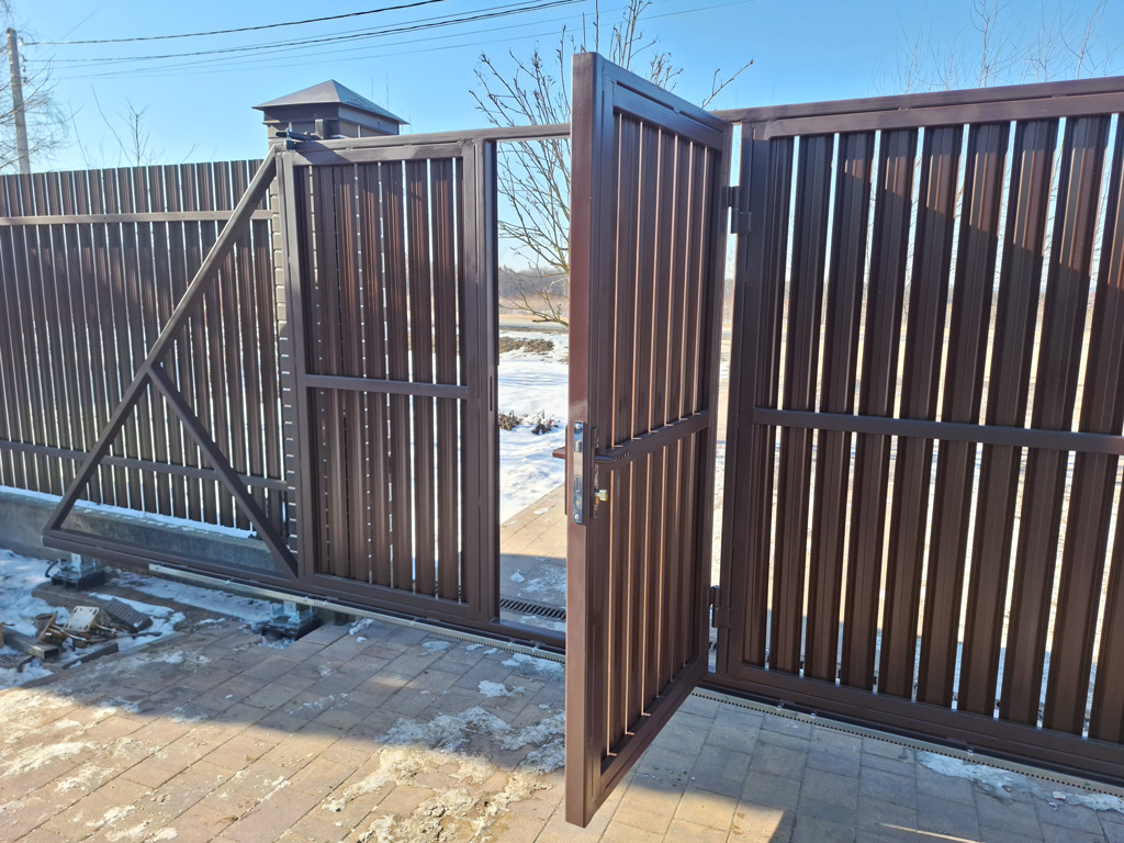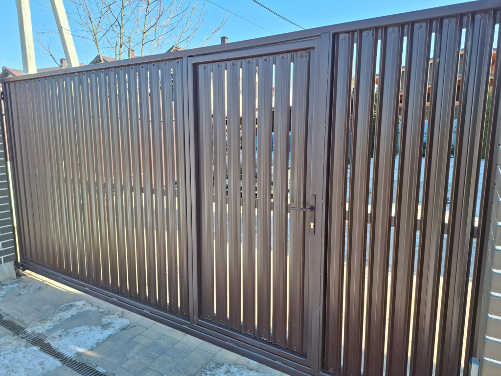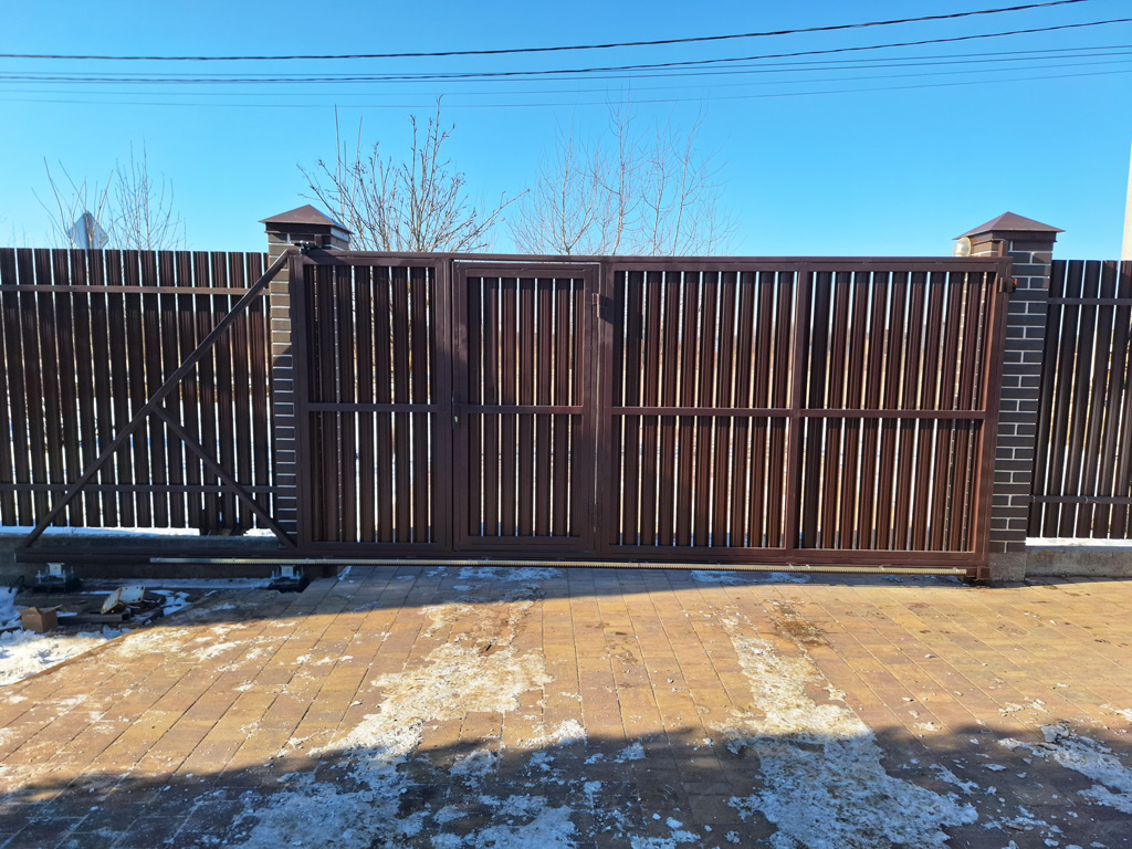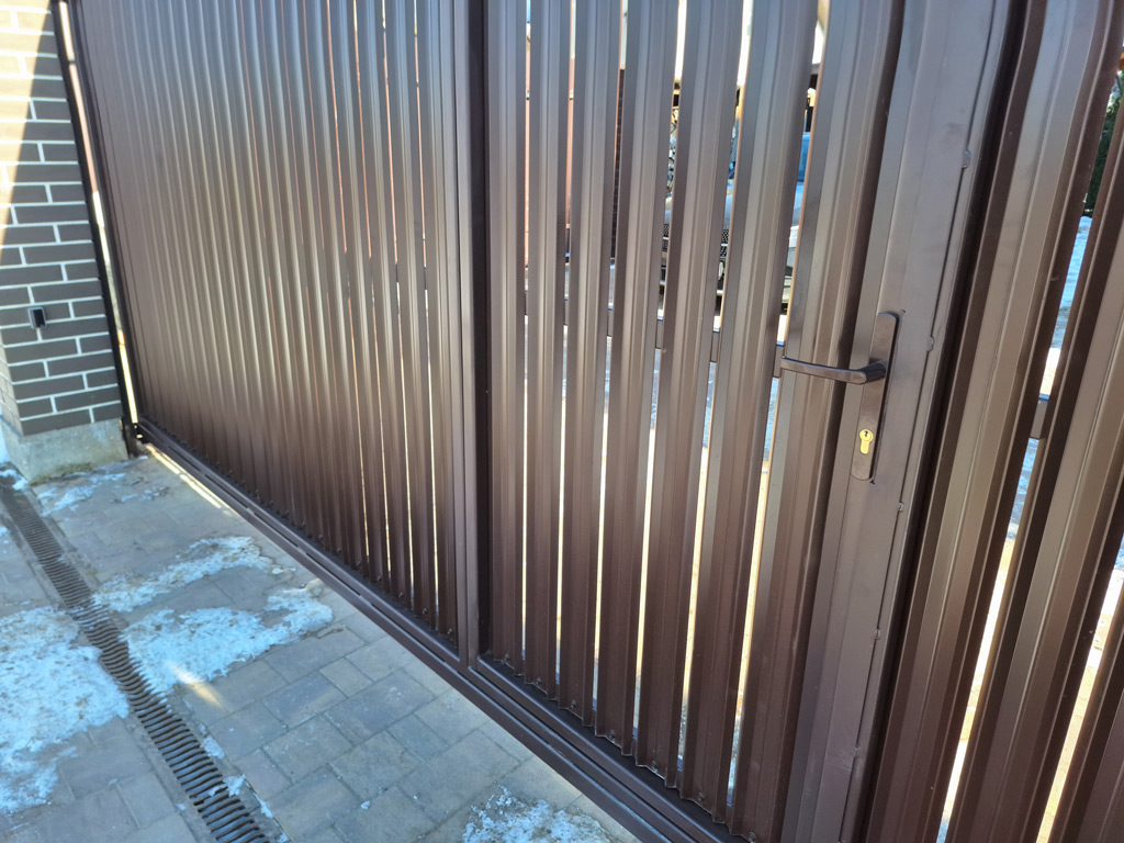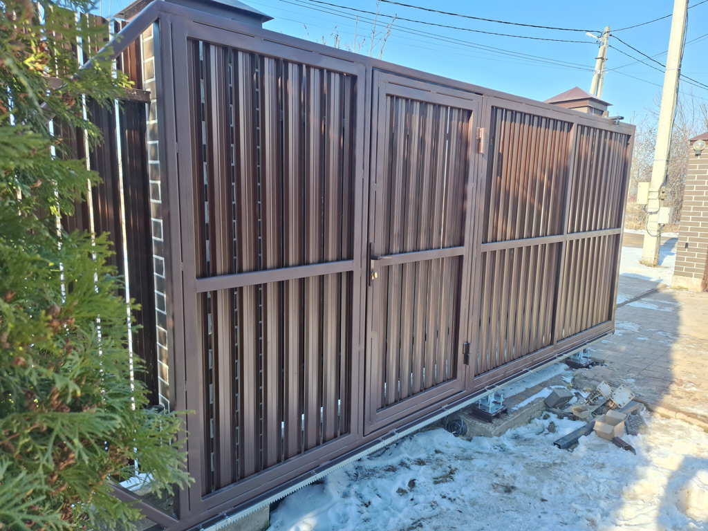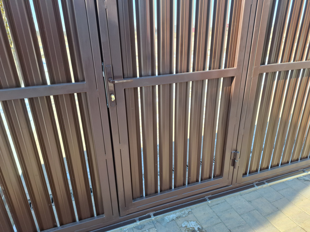 Произведены работы по демонтажу старых откатных ворот с установкой новых. Откатные ворота обшиты евроштакетником, предоставленным заказчиком, и оборудованы встроенной калиткой. Установлена зубчатая рейка для дальнейшего монтажа автоматического привода. Общий размер рабочего полотна ворот 4000х2000 мм. Каркас ворот изготовлен с использованием металлической профильной трубы сечением 60х40х2 мм. и 50х25х2 мм. Использован комплект механического открывания для откатных ворот от производителя «DoorHan». Произведена покраска каркаса ворот в два слоя эмалью по металлу 3в1 с предварительным обезжириванием металла растворителем.