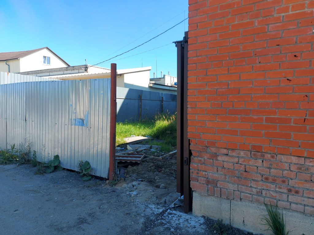 Автоматические откатные ворота на основе сварной металлической конструкции. Общая длина каркаса 7000 мм. Длина рабочей части 5000 мм. Высота 2000 мм. Ворота оборудованы автоматическим приводом «Came» BXV08AGS (Италия), рассчитанным на вес створки до 800 кг. в интенсивном режиме работы. Смонтирован блок управления GSM для открывания ворот по звонку с мобильного телефона. Ворота также открываются с пульта. Автоматика оснащена фотоэлементами для предотвращения защемления воротами различных объектов. Основание для ворот залито методом сплошного бетонирования с использованием бетона марки М350 на гравии. Ворота оборудованы калиткой с доводчиком и кодовым замком. Конструкция изготовлена для ООО "Хлебозавод №1".