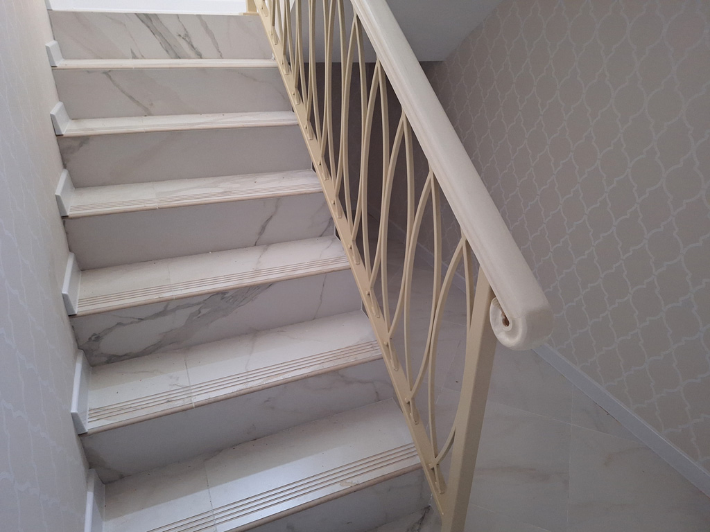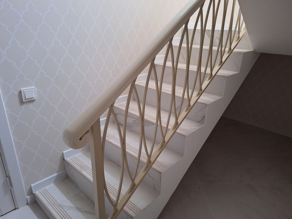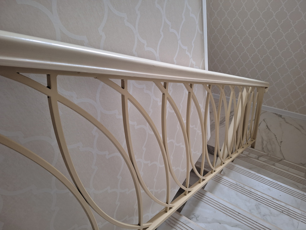 Металлические перила с деревянными поручнями из сосны. Деревянные поручни имеют завершения типа «улитка». Перила состоят из двух независимых секций. Секции изготовлены из металлической профильной трубы 40х40 мм. и 40х20 мм. с толщиной стенки 2 мм. Заполнение перил выполнено полнотелым металлическим прутком квадратного сечения толщиной 10 мм. Металлические прутки создают декоративное заполнение перил в виде овалов. Покраска произведена в два слоя: грунт + эмаль по металлу в цвет «слоновая кость» (бежевый).