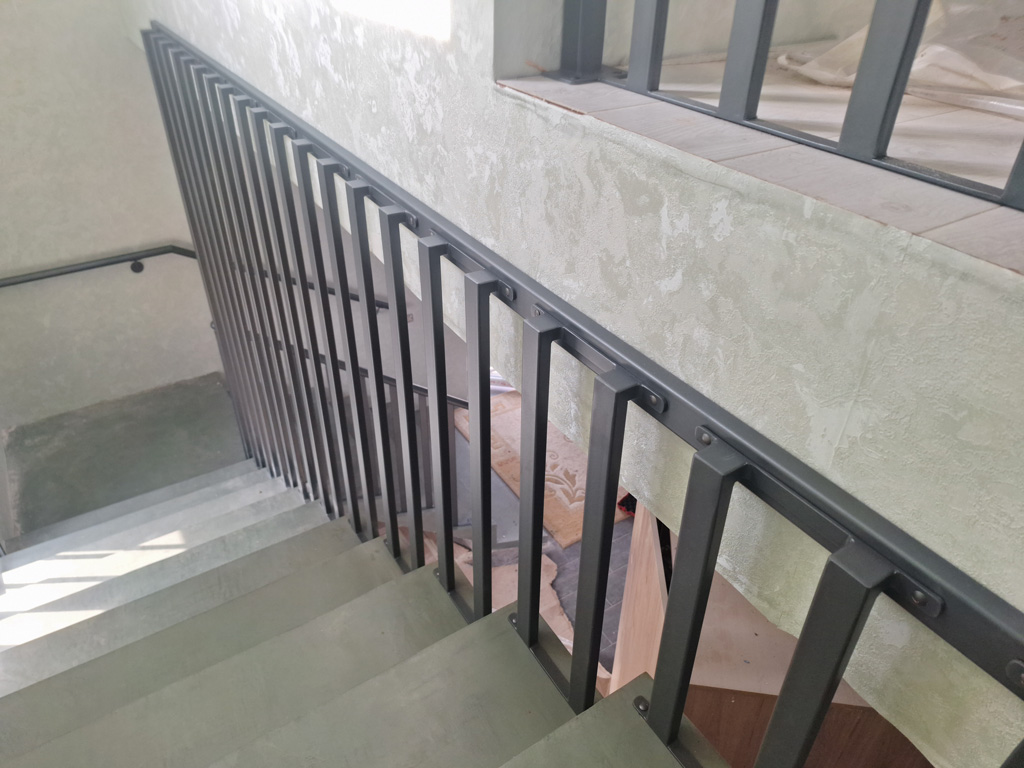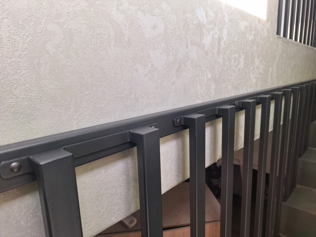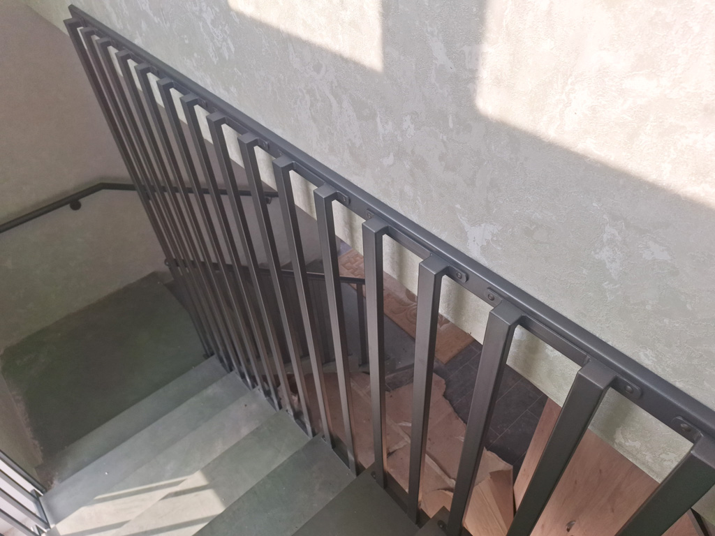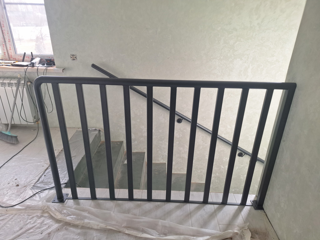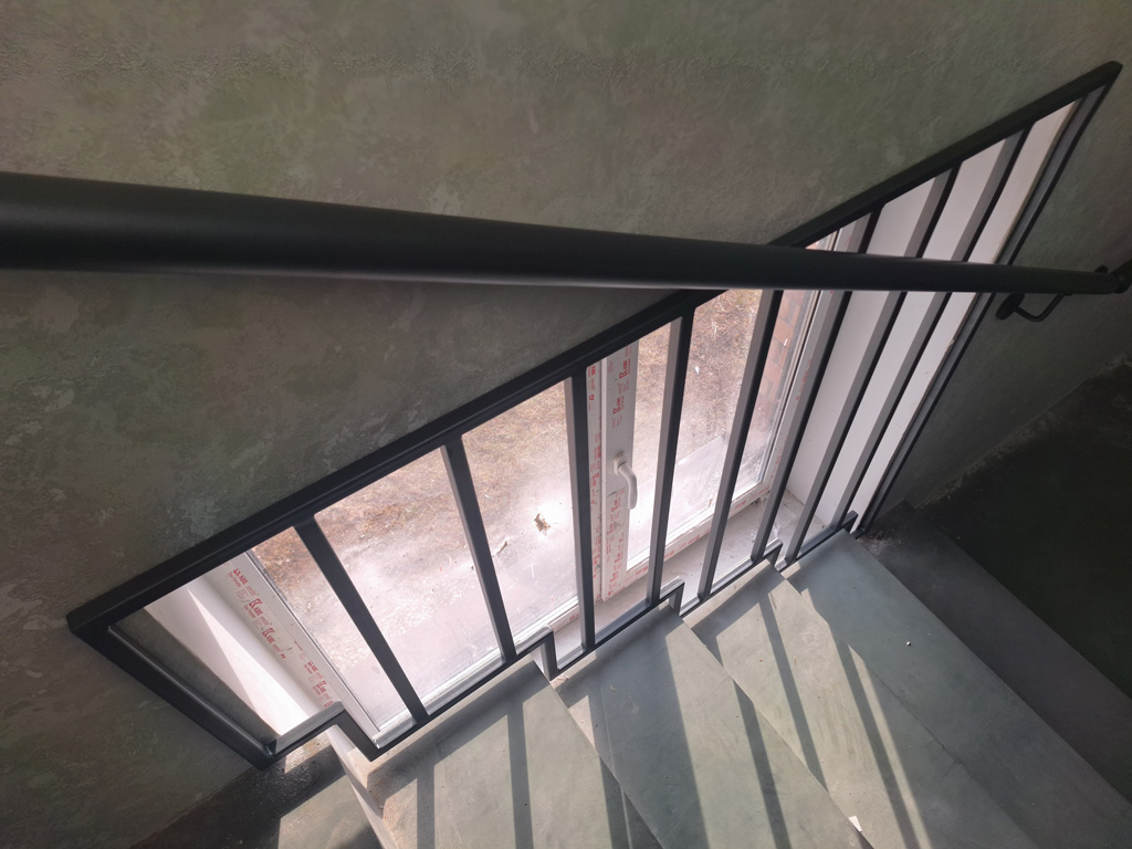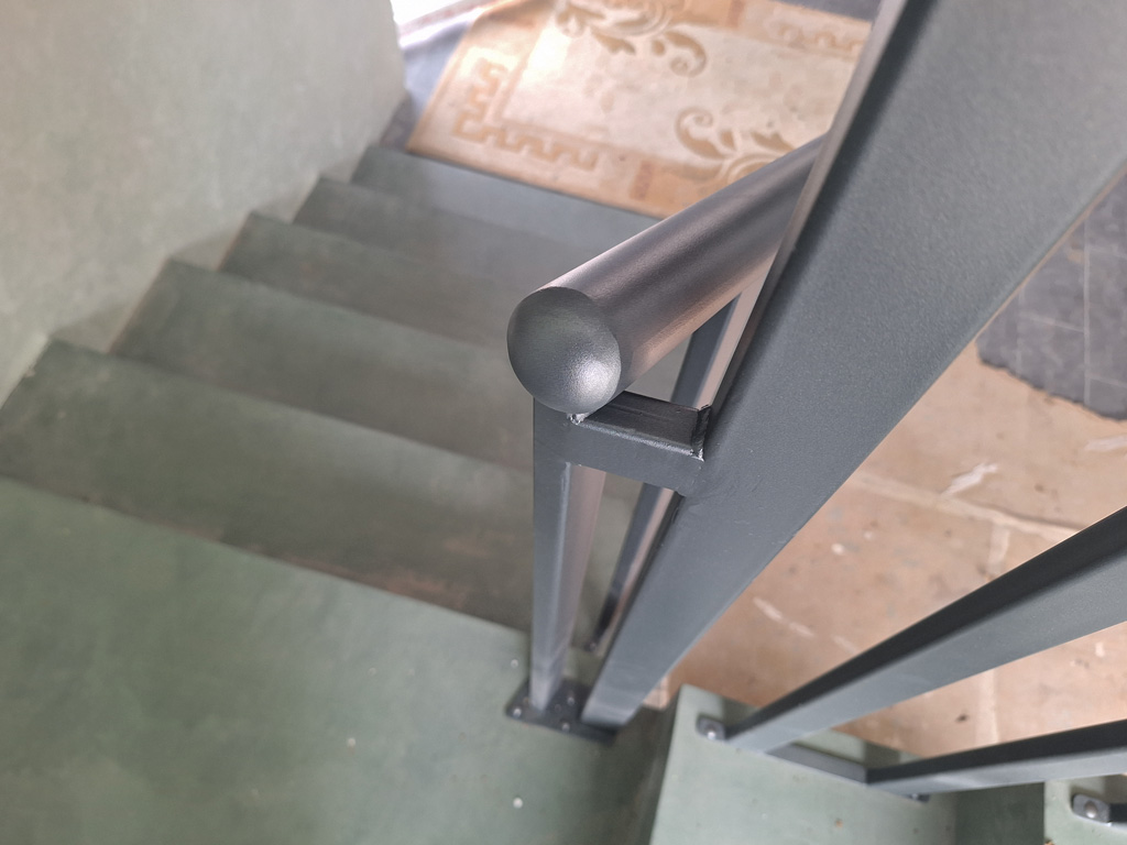 Выполнены работы по сварке нестандартных перил и ограждений с проведением сварочных работ в цеху и по месту установки с использованием полуавтоматической сварки и переносного углекислотного баллона. Поручень сделан из круглой нестандартной металлической трубы предоставленной заказчиком. Ограждение на лестницу и окно изготовлено из профильных труб сечением 40х20 и 30х30 мм. Крепление ламелей ограждения лестницы выполнено с использованием дюбель-гвоздей. Покраска металлических элементов порошковым методом в цвет RAL 7016.