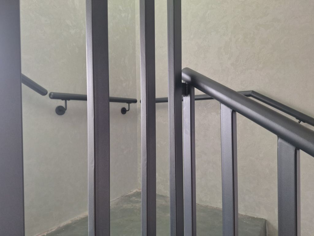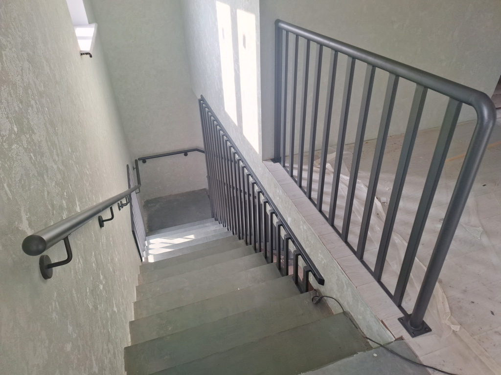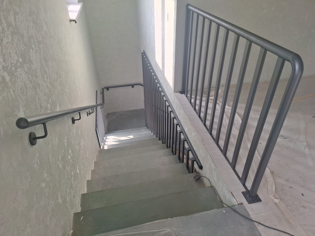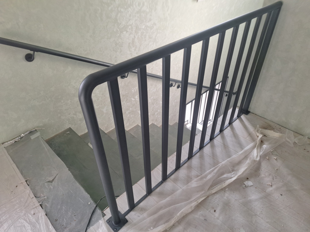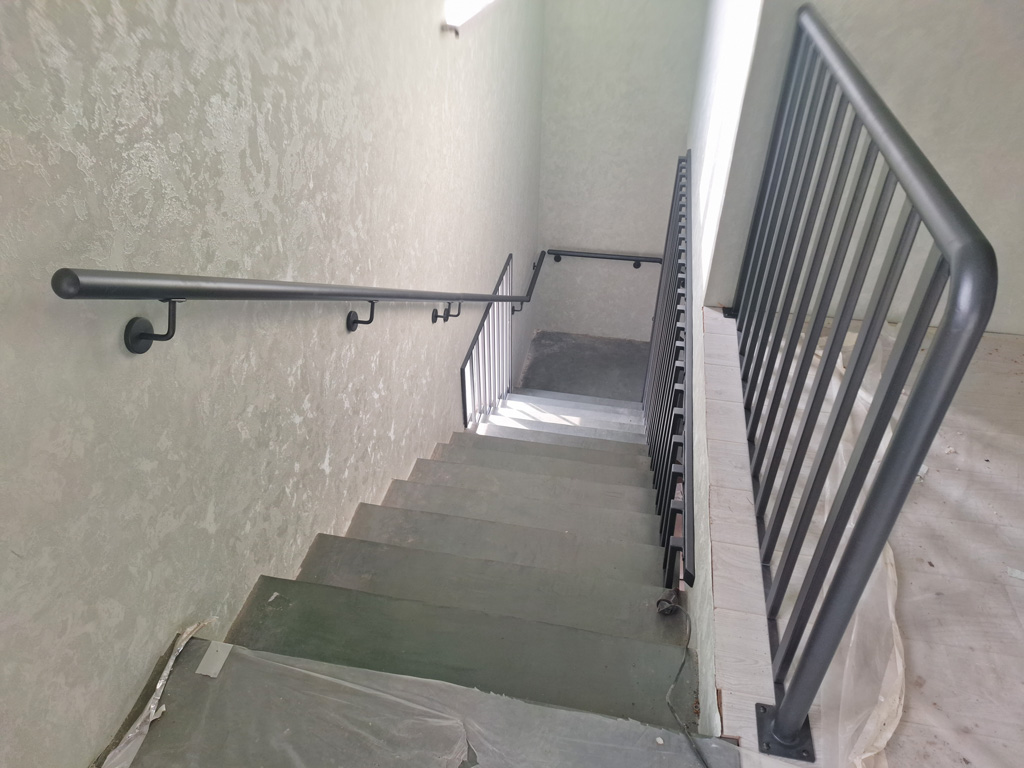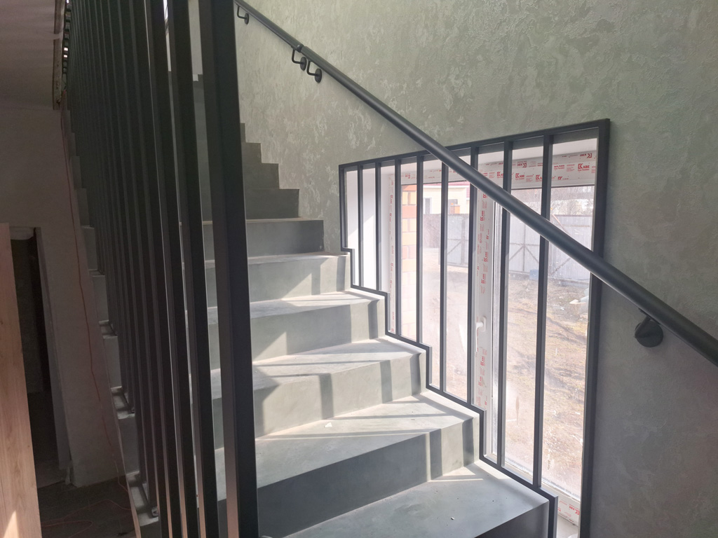 Выполнены работы по сварке нестандартных перил и ограждений с проведением сварочных работ в цеху и по месту установки с использованием полуавтоматической сварки и переносного углекислотного баллона. Поручень сделан из круглой нестандартной металлической трубы предоставленной заказчиком. Ограждение на лестницу и окно изготовлено из профильных труб сечением 40х20 и 30х30 мм. Крепление ламелей ограждения лестницы выполнено с использованием дюбель-гвоздей. Покраска металлических элементов порошковым методом в цвет RAL 7016.