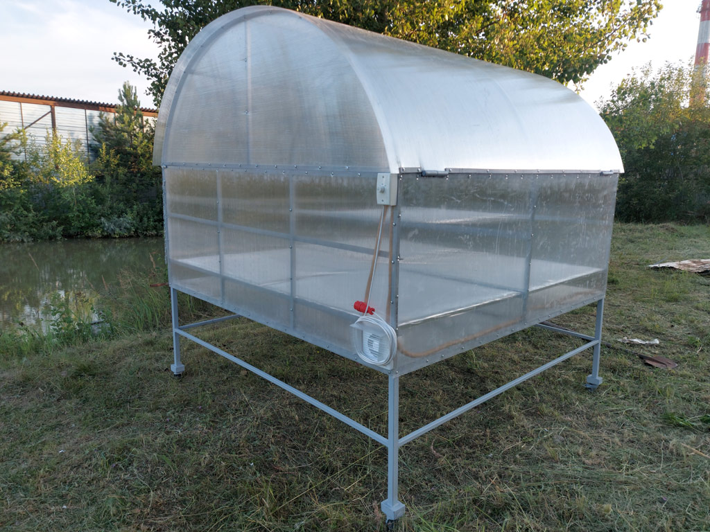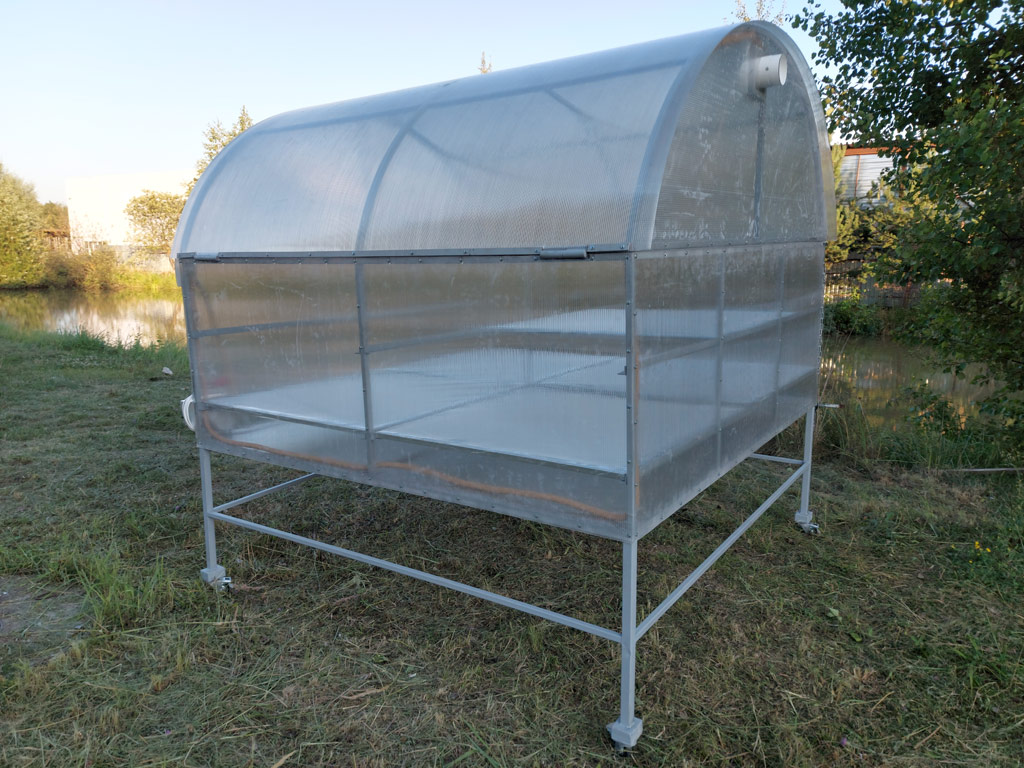 По фото и размерам заказчика изготовлена сушилка предназначенная для высушивания плавающего растения Wolffia. Общий размер конструкции 2х2х2.5 м. В работе использован поликарбонат высокой плотности толщиной 4 мм. Конструкция окрашена эмалью 3 в 1 серого цвета. Сушилка вмещает 8 лотков для просушки размером 1х1 м. Смонтированы 2 вытяжных вентилятора для уменьшения влажности воздуха работающие от сети 220 вольт с регулированием оборотов вращения. Верхняя и торцевая крышки откидываются для повышения удобства эксплуатации сушилки. Для удобства перемещения конструкции предусмотрены поворотные колёса со стопором.