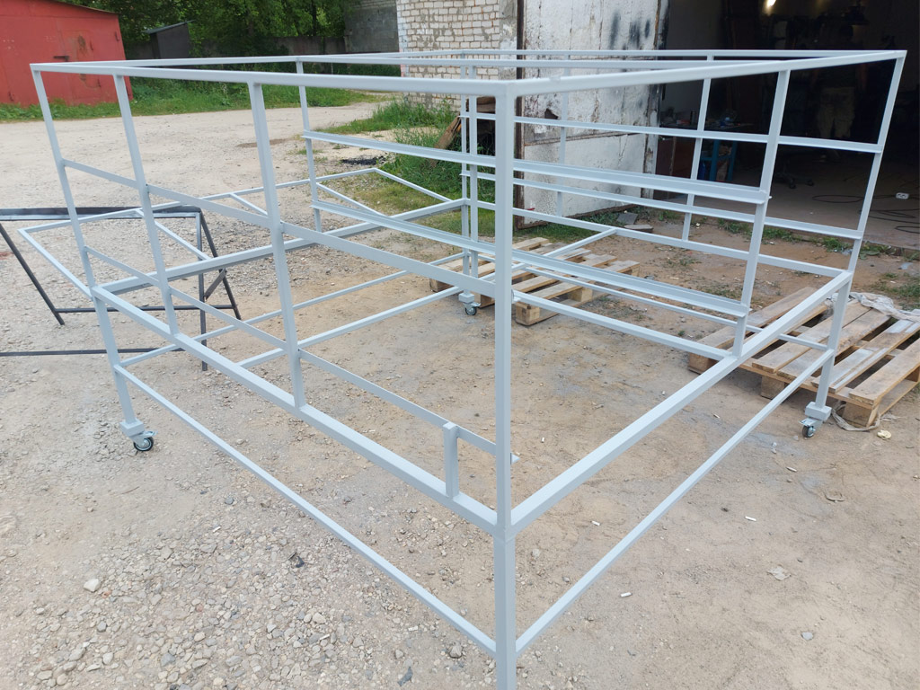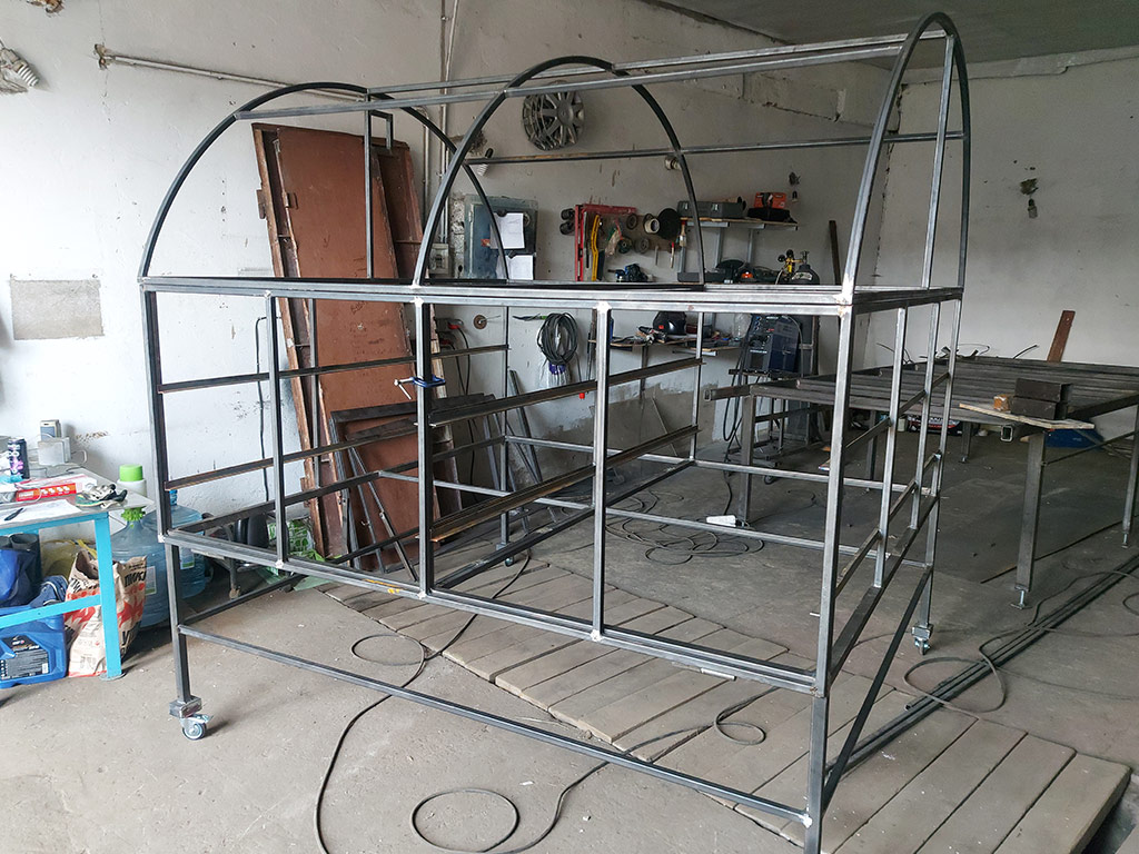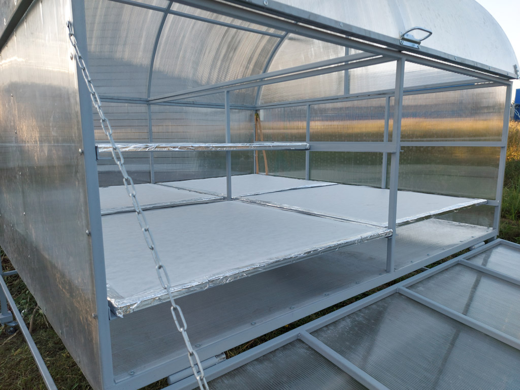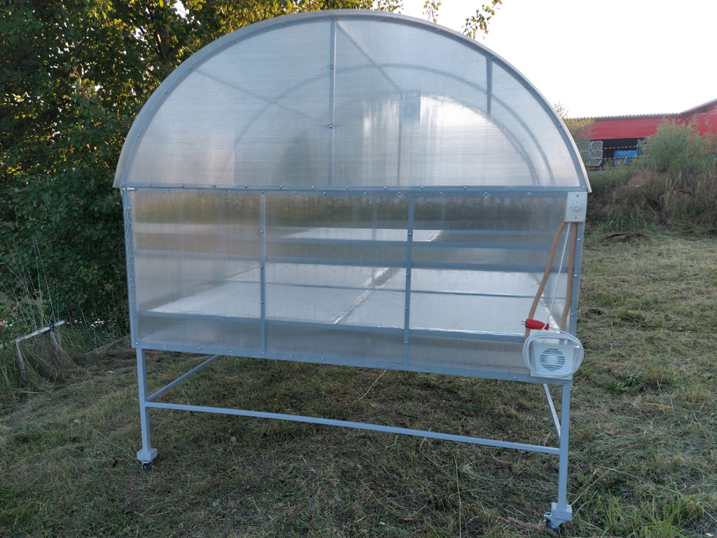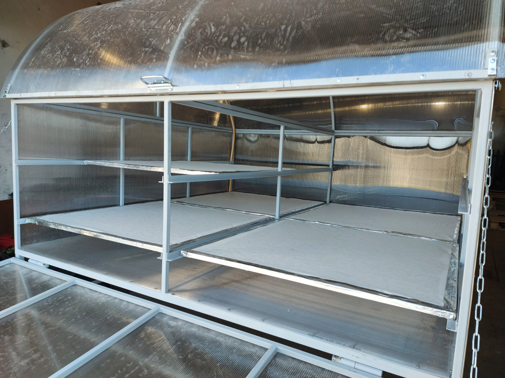 - Изготовление каркаса конструкции и лотков, обшивка сушилки сотовым поликарбонатом.