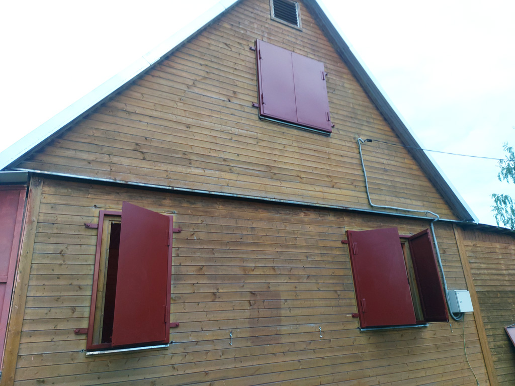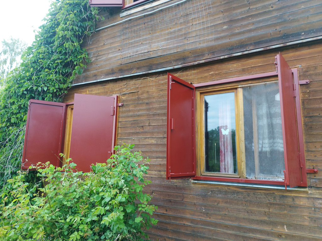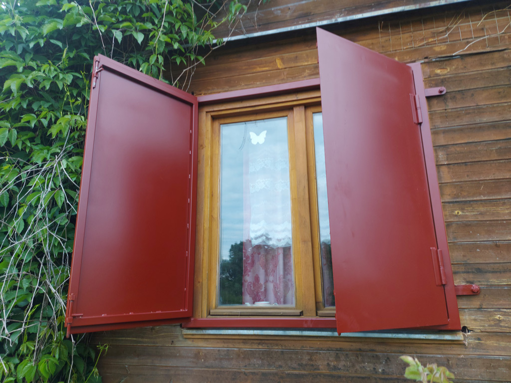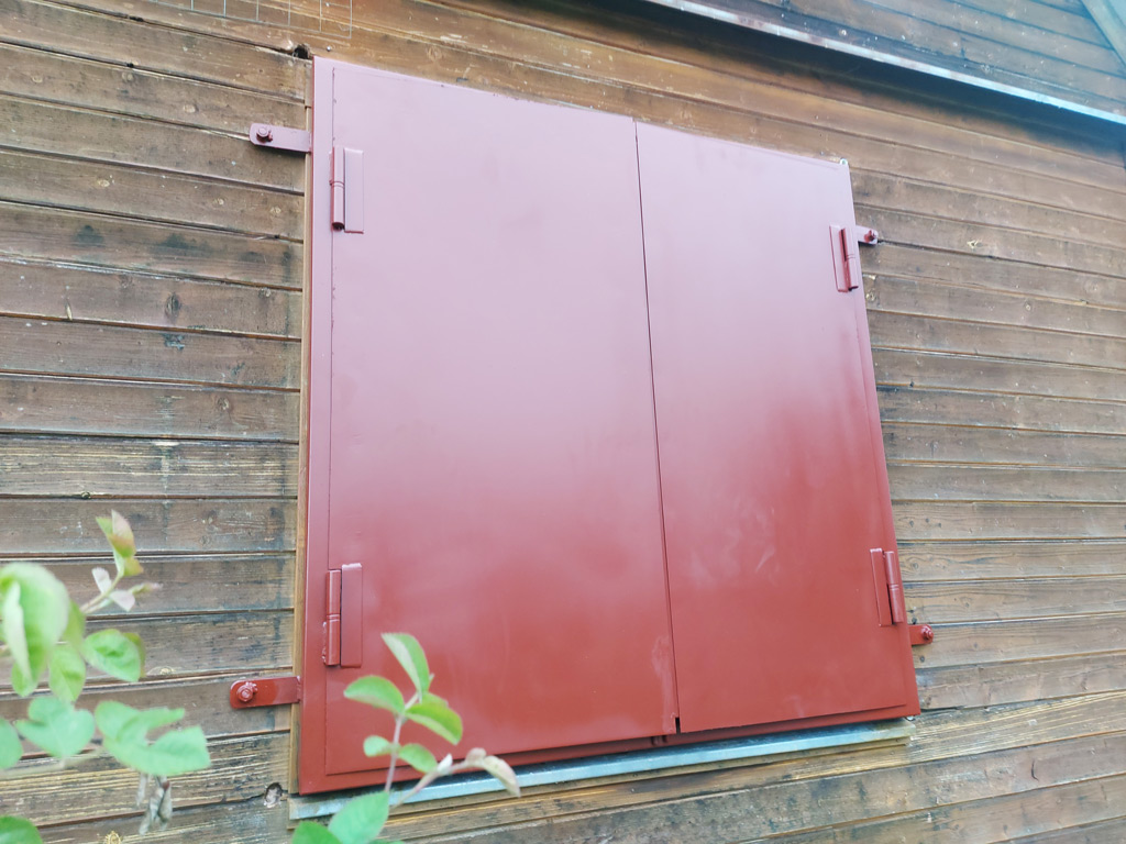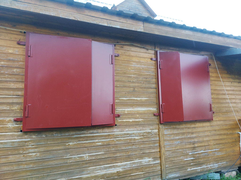 Изготовлены ставни на окна из листового металла толщиной 2 мм. Семь ставень - двустворчатые, размером 1220х1200 мм. Одна ставня - одностворчатая, размером 690х1220 мм. При изготовлении использовалась металлическая профильная труба сечением 40х40 и 30х20 мм. с толщиной стенки 2 мм. Все ставни оборудованы задвижками с внутренней стороны. Выполнена покраска изделий в один слой эмалью по металлу.