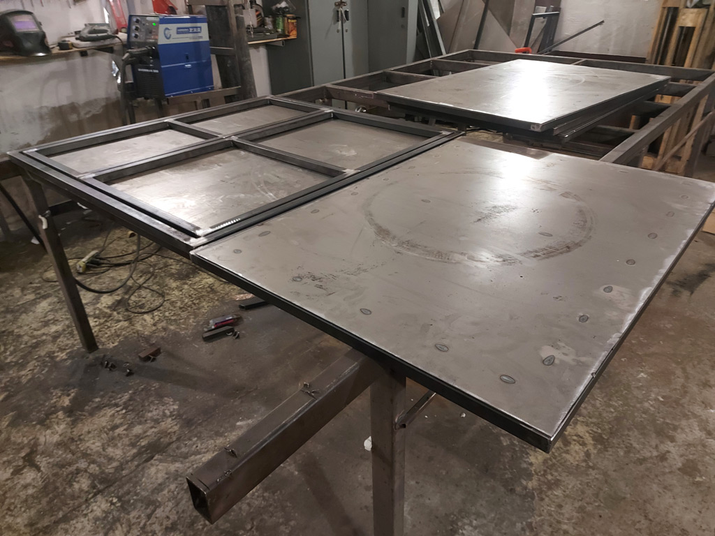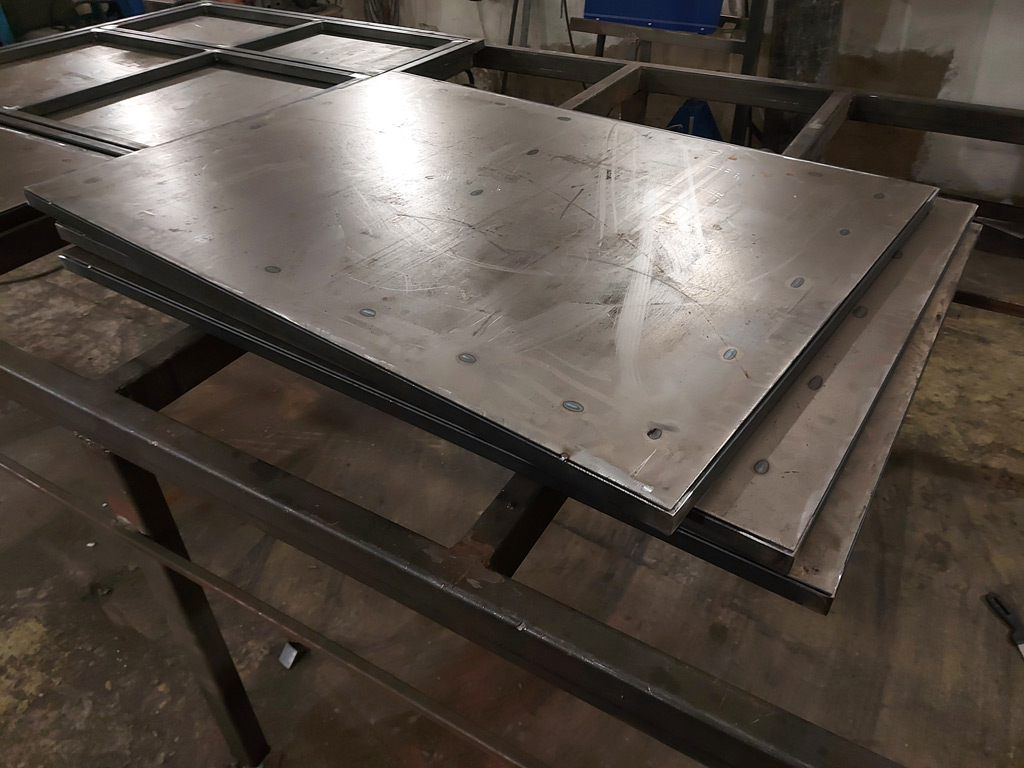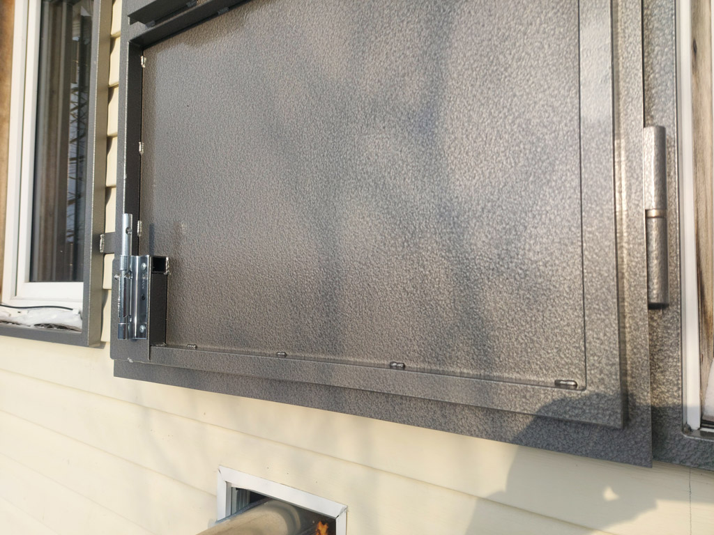 Изготовлено 5 ставней на окна. Четыре в одностворчатом варианте размером 800х1100 мм., и одна в двухстворчатом варианте размером 1100х1100 мм. Ставни запираются на засовы (производитель Apecs) с внутренней стороны и могут сниматься в летний период. При изготовлении использована холоднокатаная листовая сталь толщиной 2 мм. Каркасы выполнены из металлической профильной трубы 25х25 мм. Ставни окрашены грунт-эмалью 3 в 1 с молотковым эффектом в серый цвет. Использованы дверные петли на подшипниках для лёгкой и тихой работы створок.