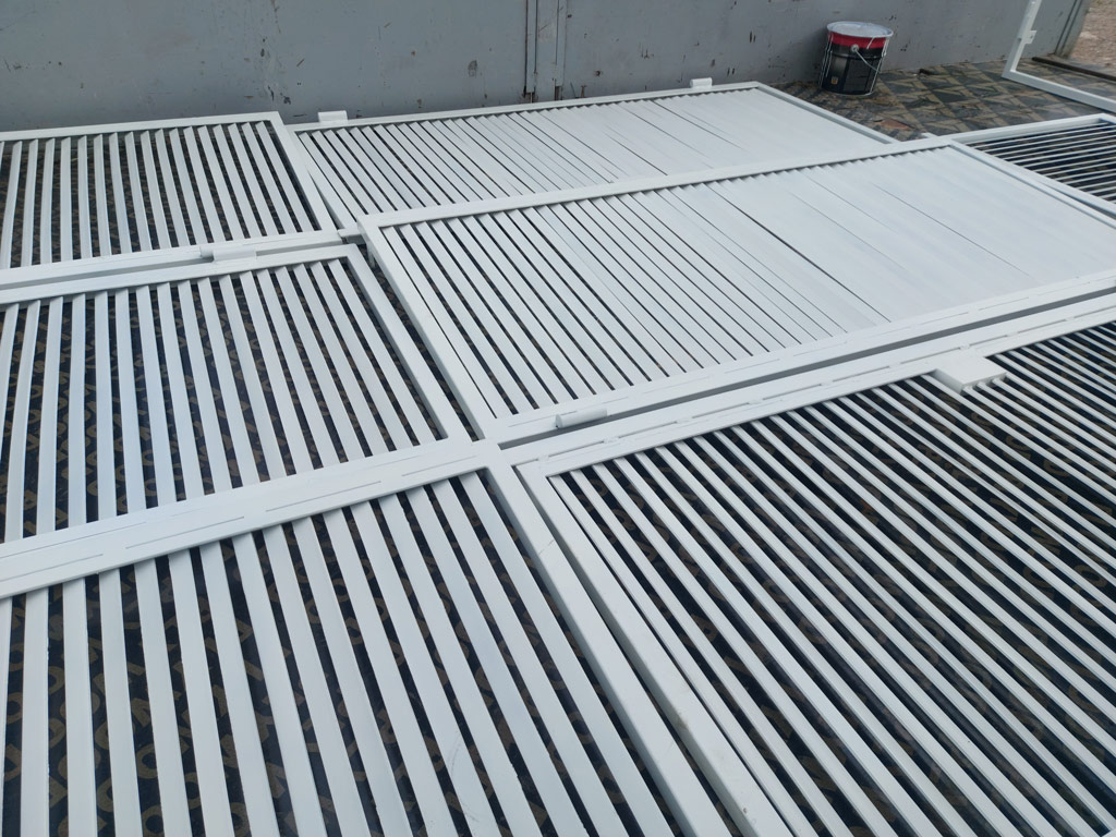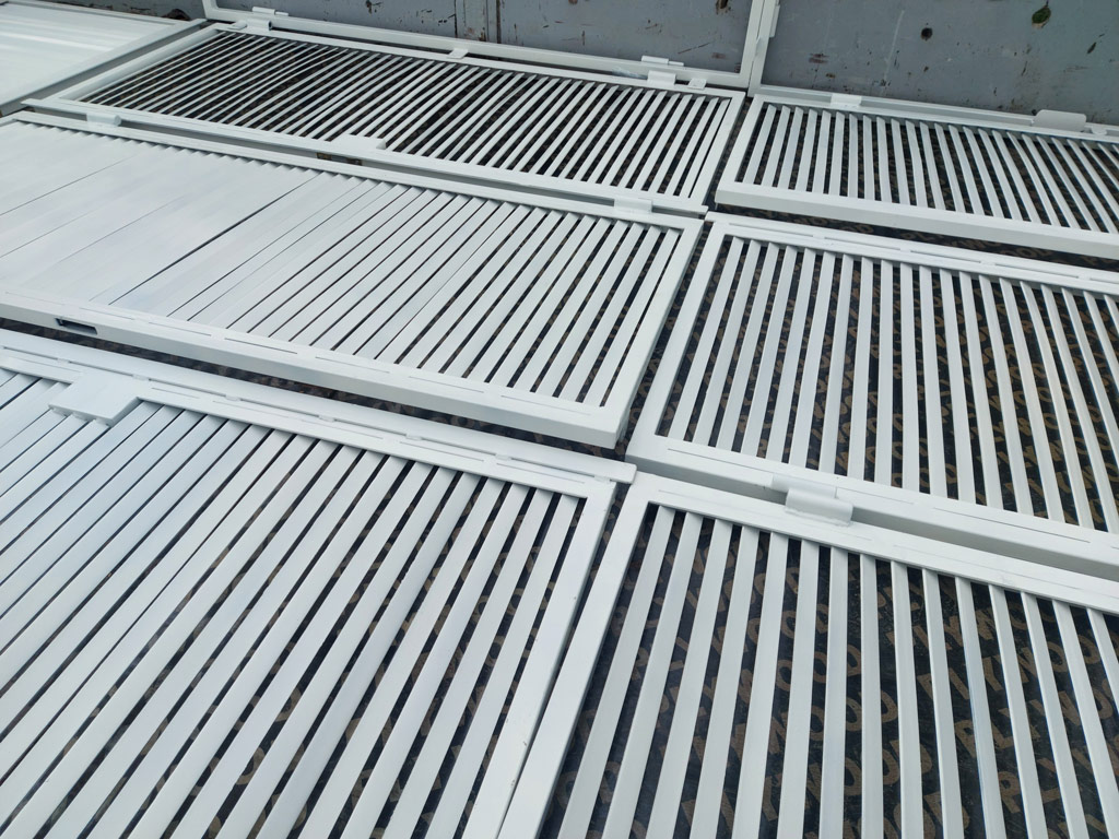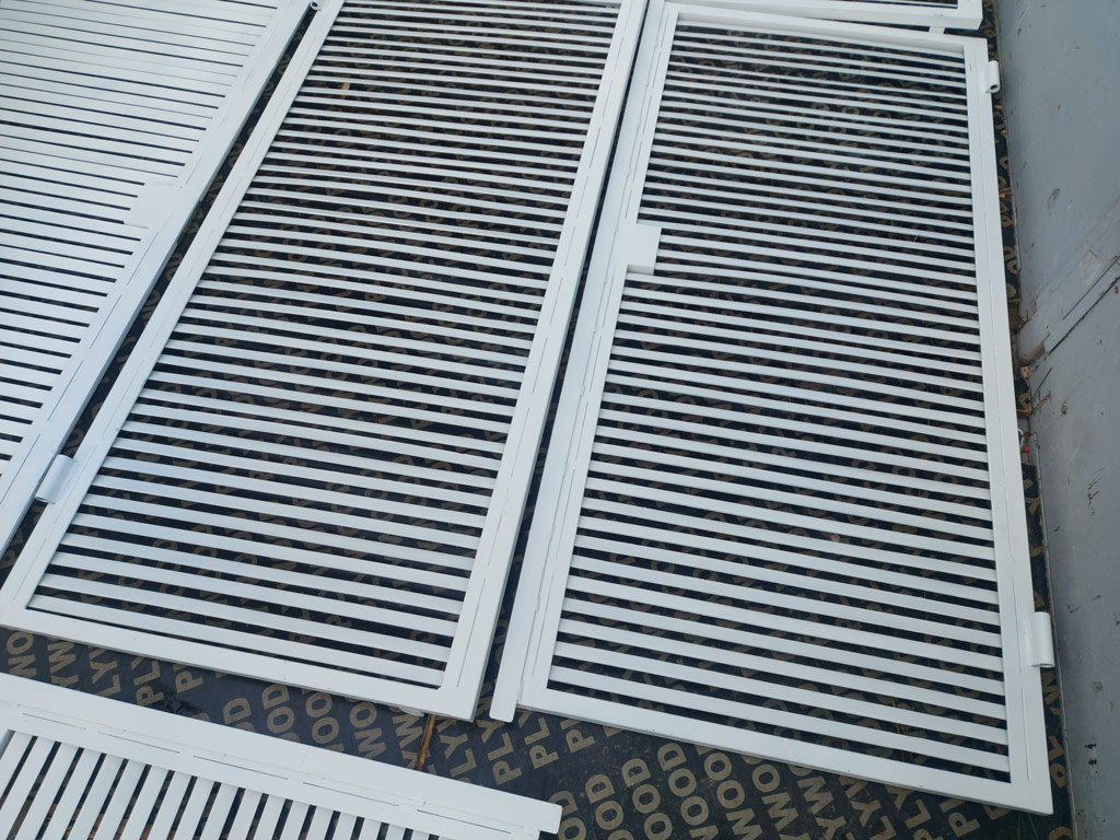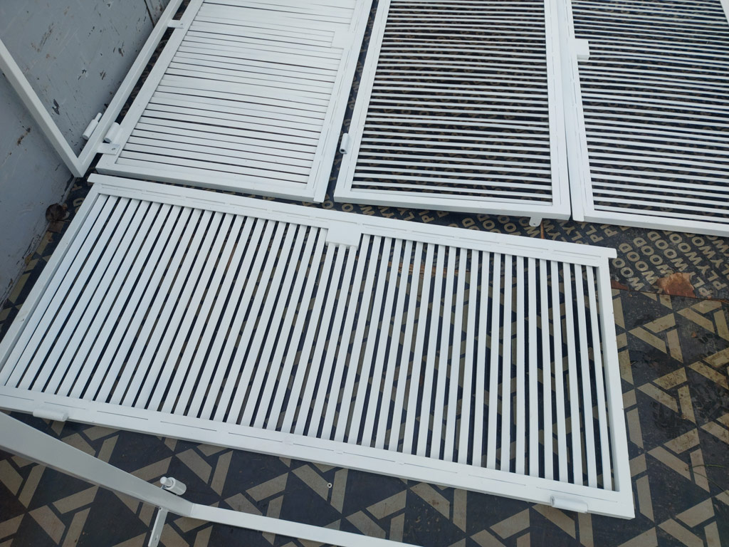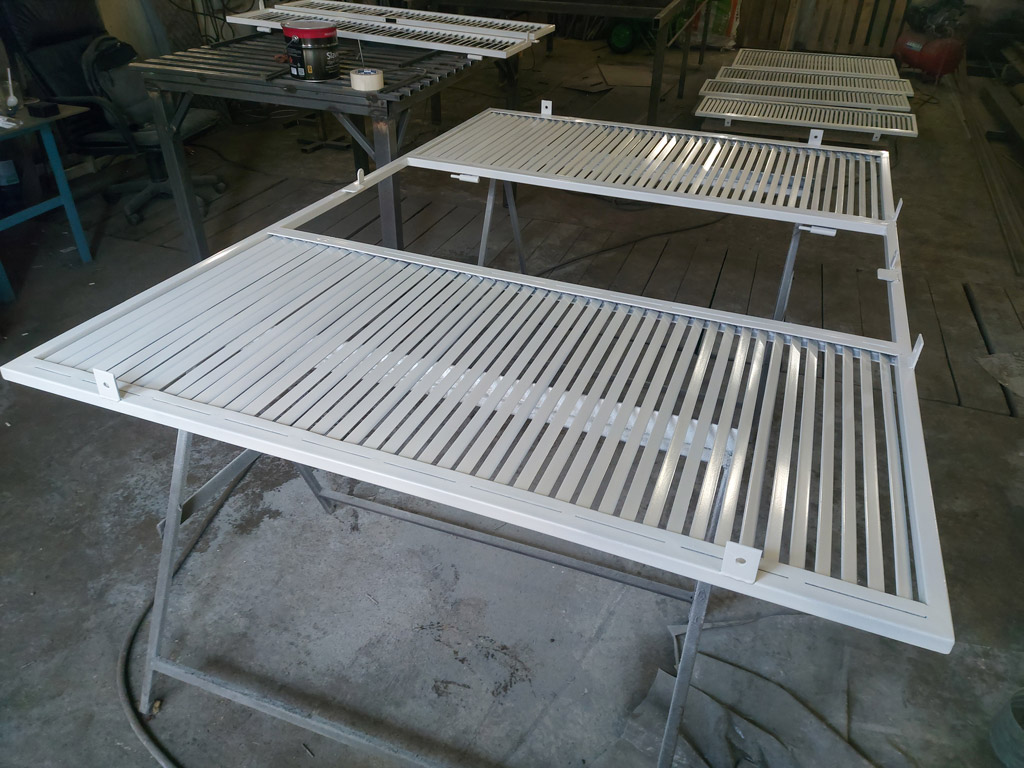 Изготовлен комплект ставен в количестве четырёх штук (8 створок). Наружная рама выполнена из профильной трубы 25х25 мм. толщиной 2 мм. Ламели изготовлены из полосы шириной 20 мм. толщиной 3 мм. Размеры изделий: 1360х1480 мм. - 1 шт., 1370х1480 мм. - 1 шт., 1370х1500 мм. - 2 шт. Металл окрашен грунт-эмалью 3 в 1 Slaven (цвет белый). Ставни закрываются на внутренний сувальдный замок.