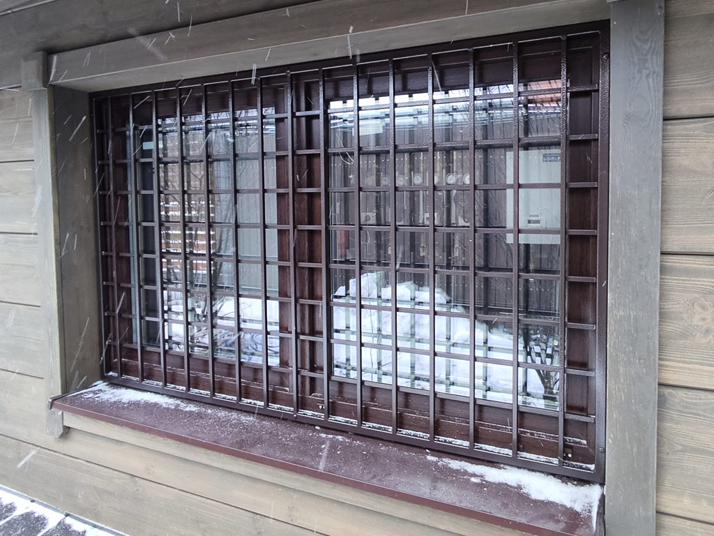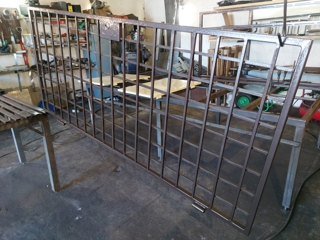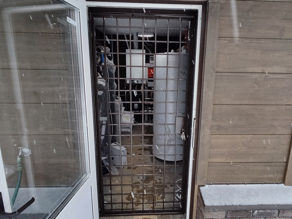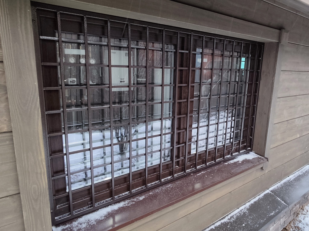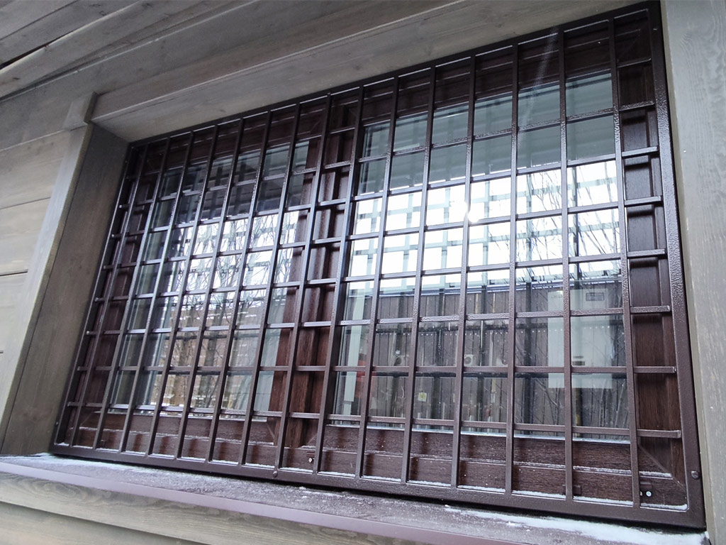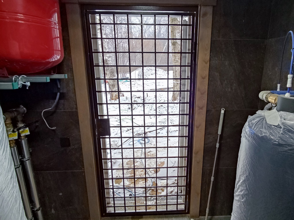 Изготовлены две сварные металлические двери решётчатого типа и глухая решётка на окно для котельной частного дома. Размер решётки - 1750х1050 мм. Размер металлических дверей - 950х2040 мм. и 740х2040 мм. Вертикальное и горизонтальное заполнение изделий выполнено с использованием полнотелого металлического прутка сечением 12 мм. Размер ячейки дверей и решётки 100х100 мм. Двери оснащены врезными замками сувальдного типа. Металл покрыт молотковой краской от производителя «Dali» в 2 слоя.