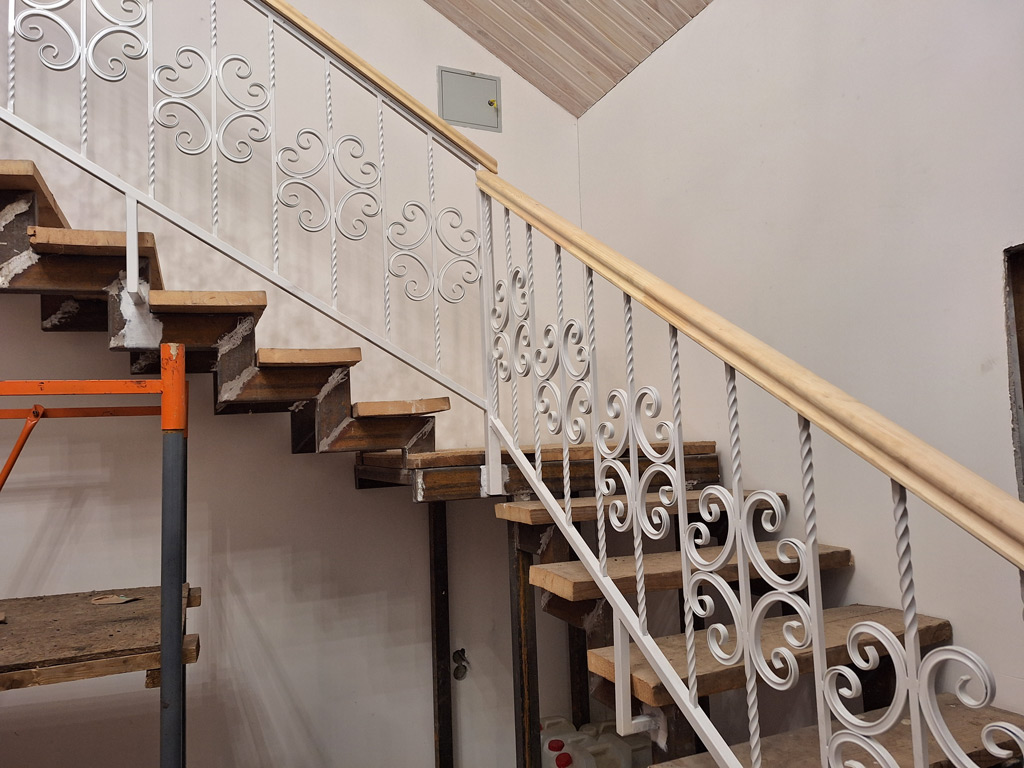Металлические перила с деревянными поручнями из сосны. Заполнение перил выполнено с использованием металлических холодногнутых декоративных элементов типа «Вензель» и «Торсион». Перила состоят из пяти секций высотой 900 мм. Общая длина секций 8,5 погонных метров. Секции перил изготовлены из металлической профильной трубы 40х40 мм. и 40х20 мм. с толщиной стенки 2 мм. Покраска в два слоя: грунт по металлу + эмаль по металлу белого цвета.