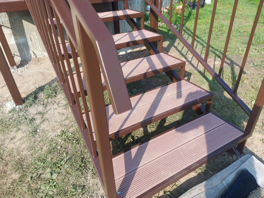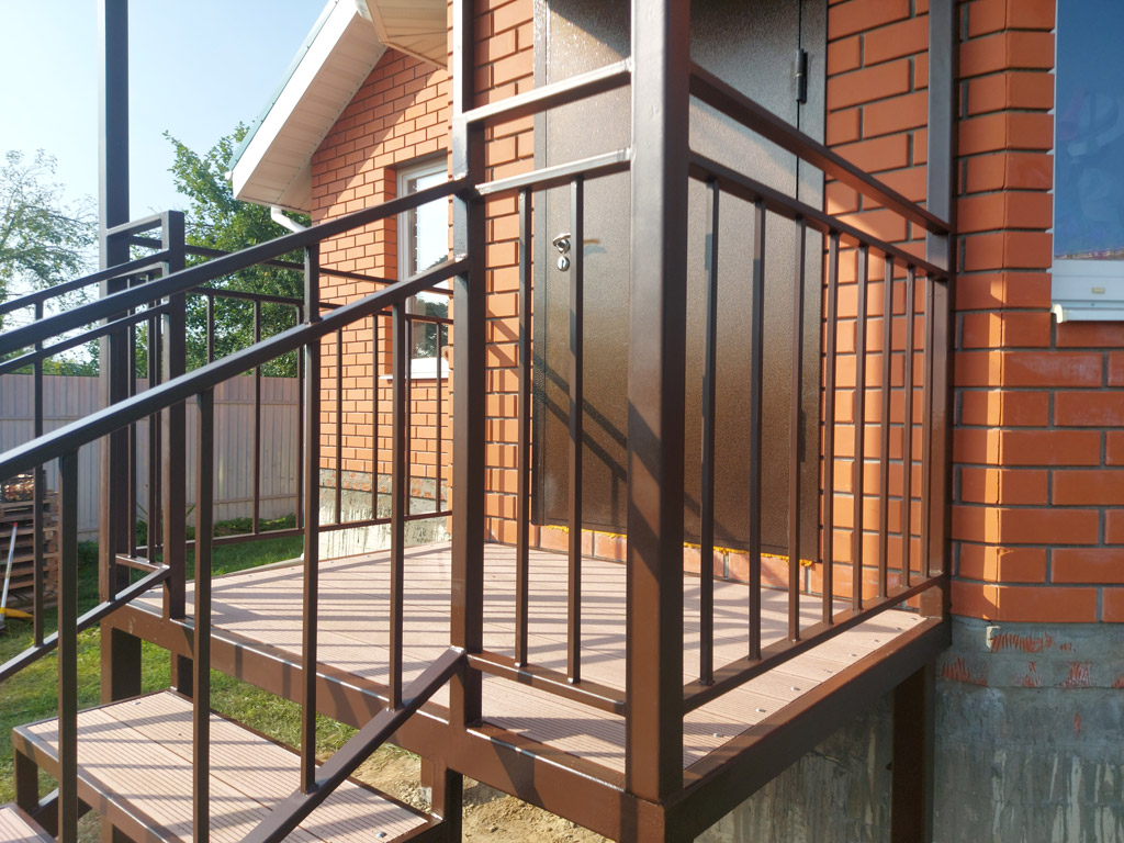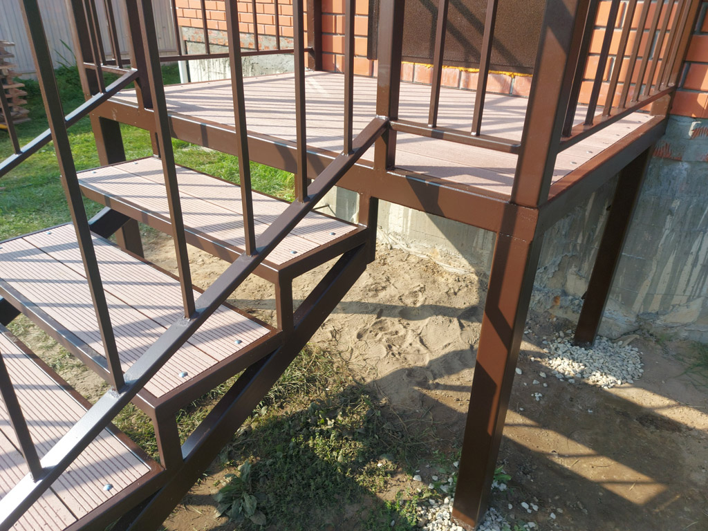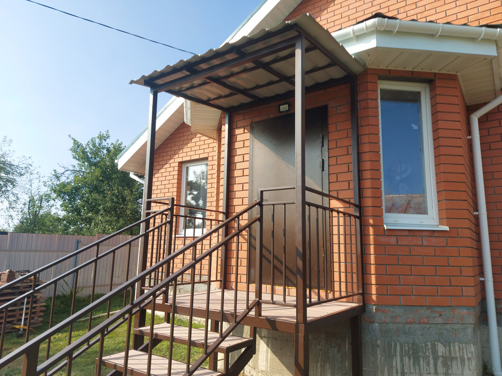 Входная группа на основе сварного металлического каркаса состоит из: площадки, ступеней, ограждения, перил и козырька. Размер входной группы по площадке 1850х1350 мм. Козырёк имеет покрывную площадь 1950х1450 мм. Столбы под площадку изготовлены из металлической профильной трубы сечением 80х80 мм. с толщиной стенки 3 мм. с установкой методом «бутования» на глубину 120 см. Обшивка пола площадки и ступеней выполнена террасной доской ДПК от производителя «Woodgrand» в цвете «терракот» толщиной 20 мм. с использованием монтажной ленты для металлокаркаса. Крепёж террасной доски к каркасу реализован с использованием мебельных болтов.