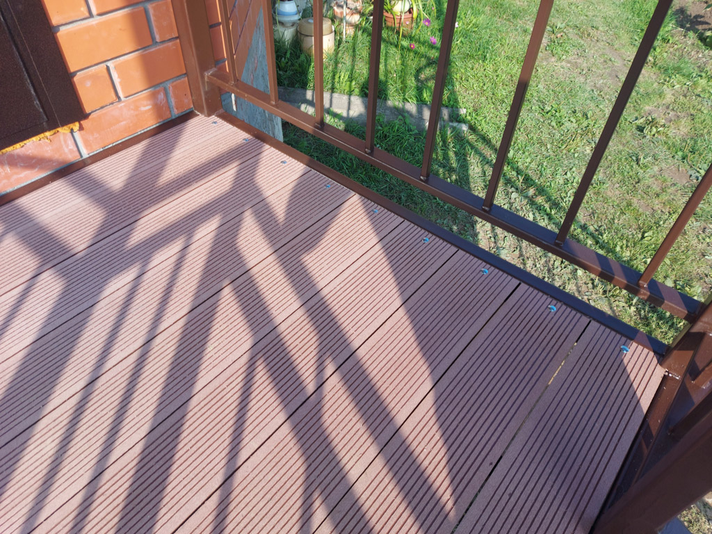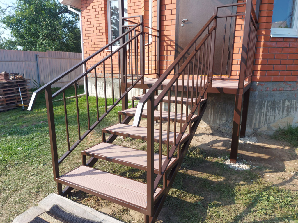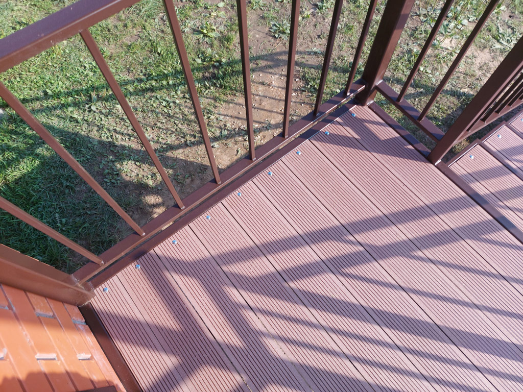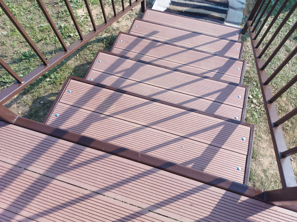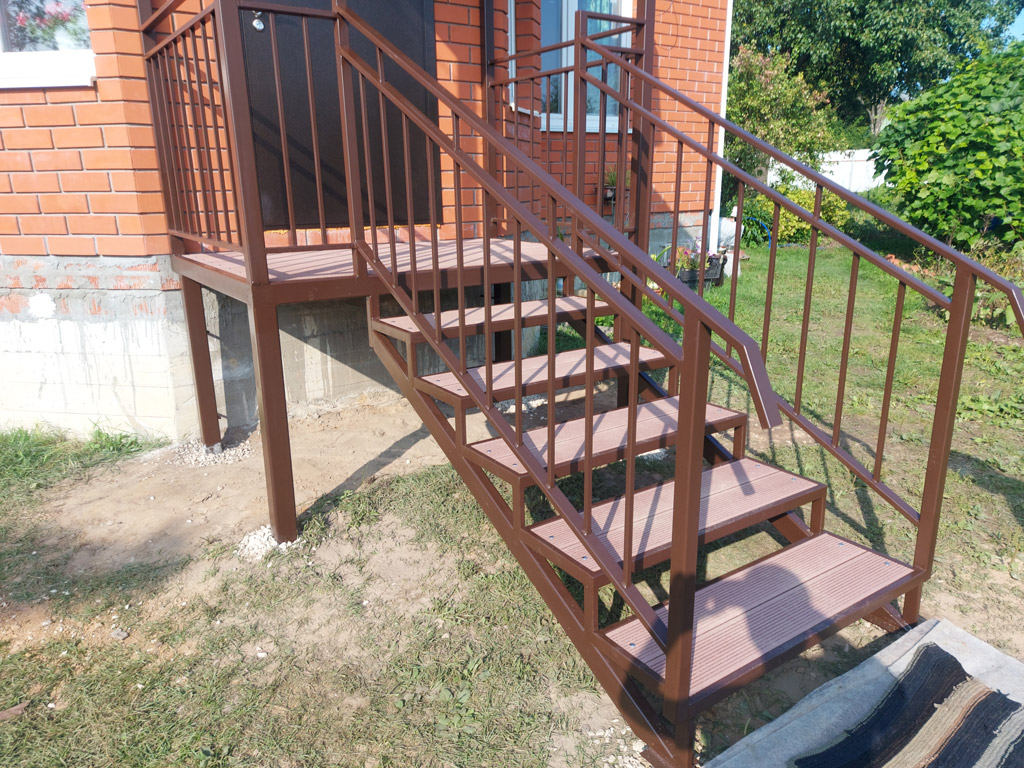Входная группа на основе сварного металлического каркаса состоит из: площадки, ступеней, ограждения, перил и козырька. Размер входной группы по площадке 1850х1350 мм. Козырёк имеет покрывную площадь 1950х1450 мм. Столбы под площадку изготовлены из металлической профильной трубы сечением 80х80 мм. с толщиной стенки 3 мм. с установкой методом «бутования» на глубину 120 см. Обшивка пола площадки и ступеней выполнена террасной доской ДПК от производителя «Woodgrand» в цвете «терракот» толщиной 20 мм. с использованием монтажной ленты для металлокаркаса. Крепёж террасной доски к каркасу реализован с использованием мебельных болтов.