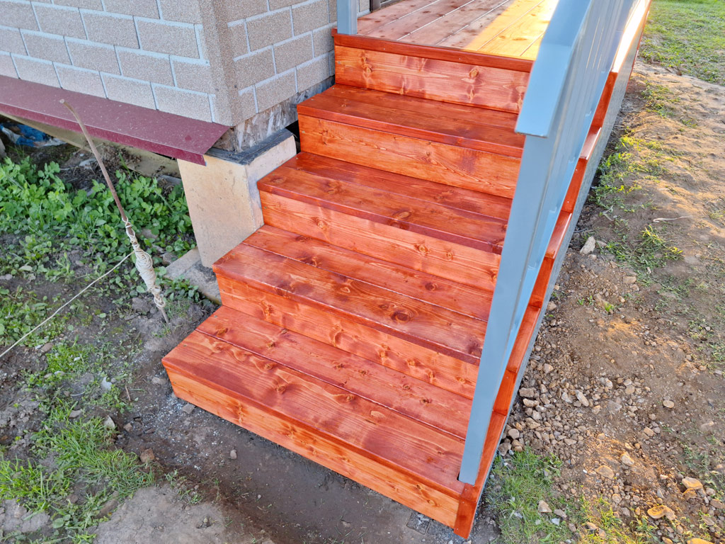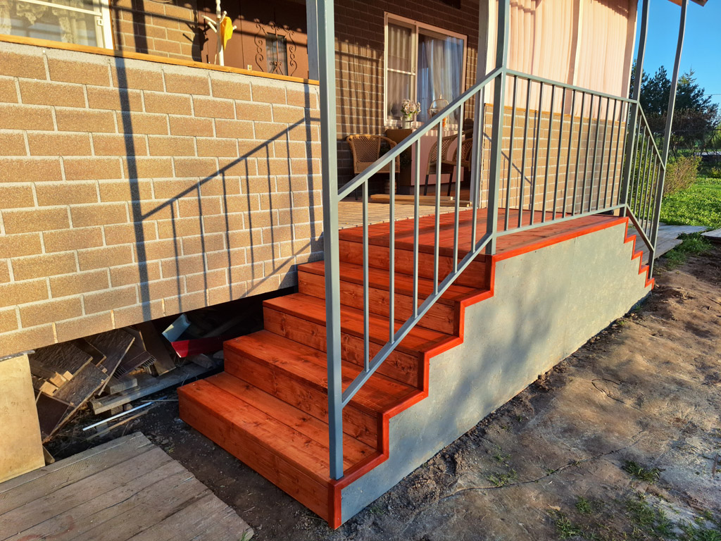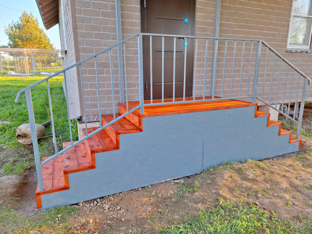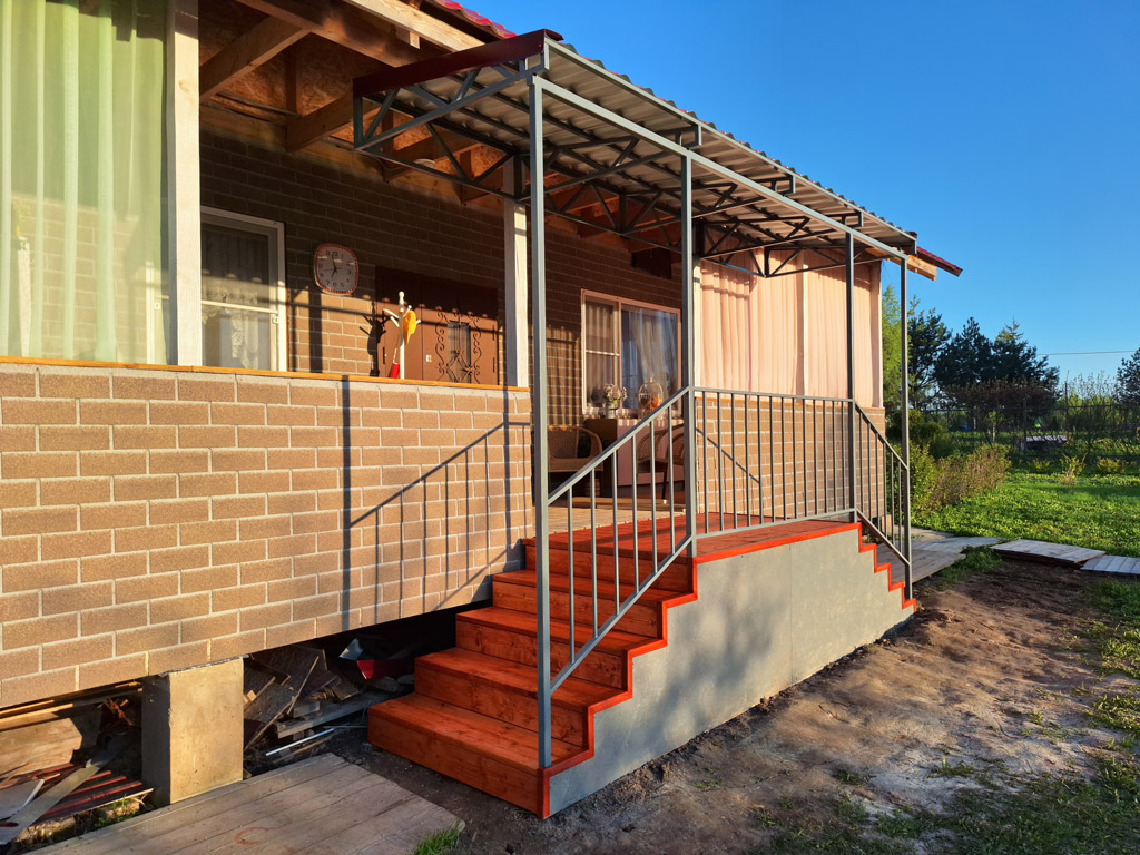 Произведён монтаж двух входных групп для дачного дома. Общий размер конструкций 2150х1200 и 1800х1000 мм. Сварные металлические каркасы обшиты сосной типа «планкен» толщиной 30 мм. с предварительной обработкой маслом по дереву для наружного применения в 3 слоя. Торец каркаса обшит крашенным листом OSB-3. Монтаж каркасов входных групп реализован методом «бутования» на металлические столбы сечением 40х40 мм. с толщиной стенки 3 мм. Металлические элементы конструкции покрашены в два слоя (грунт + эмаль по металлу 3в1). Входные группы оснащены перилами высотой 900 мм. и козырьком с покрытием металлической черепицей в цвете RAL 3005 (красное вино).