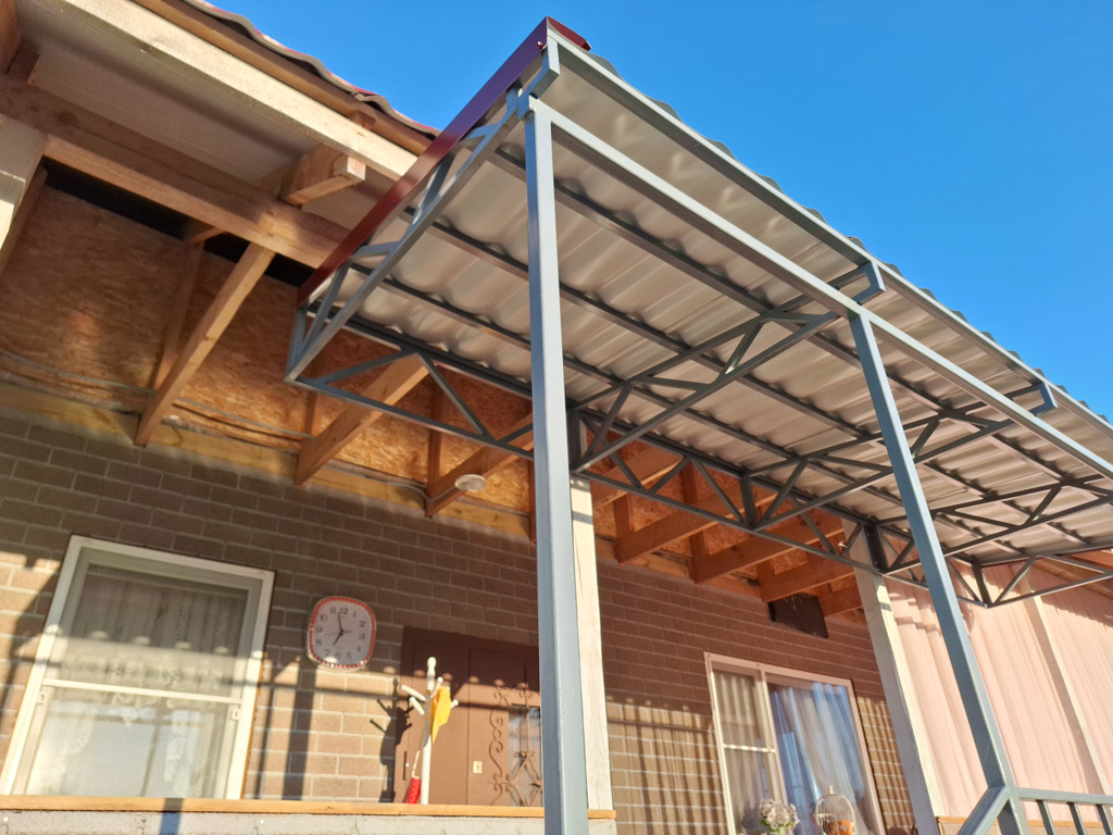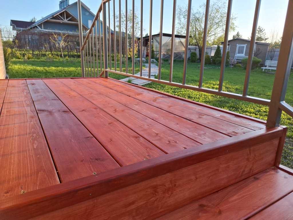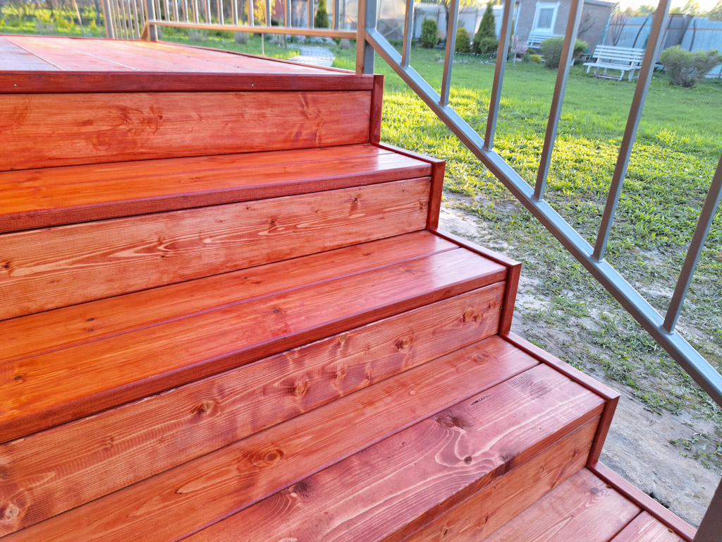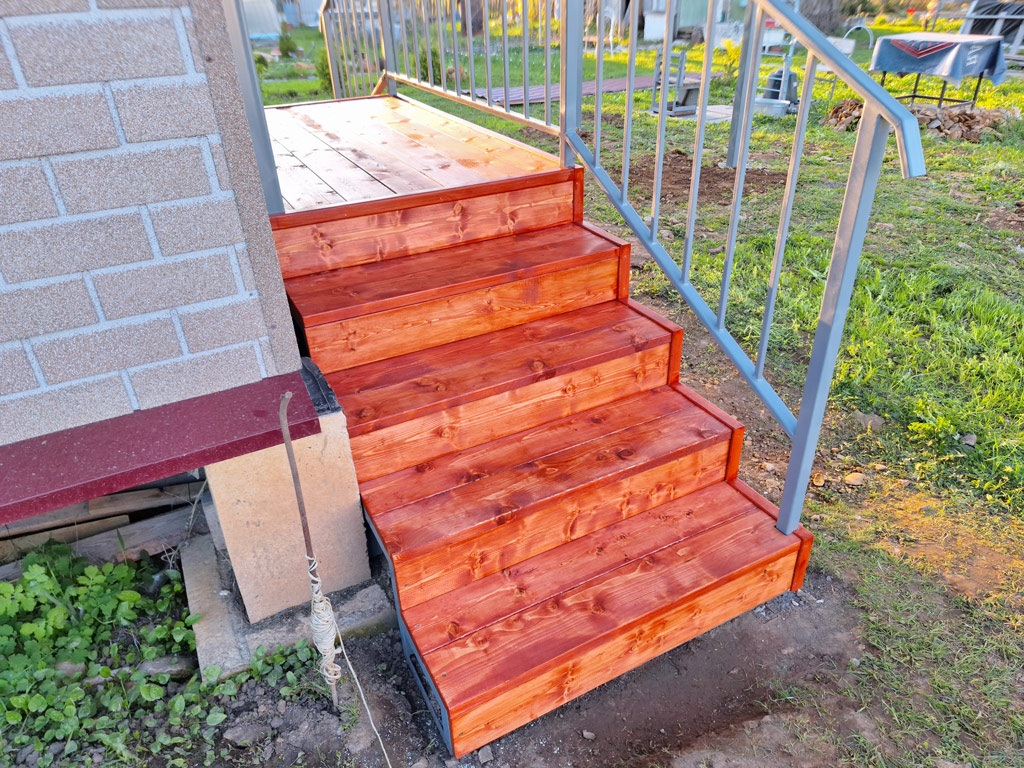 Произведён монтаж двух входных групп для дачного дома. Общий размер конструкций 2150х1200 и 1800х1000 мм. Сварные металлические каркасы обшиты сосной типа «планкен» толщиной 30 мм. с предварительной обработкой маслом по дереву для наружного применения в 3 слоя. Торец каркаса обшит крашенным листом OSB-3. Монтаж каркасов входных групп реализован методом «бутования» на металлические столбы сечением 40х40 мм. с толщиной стенки 3 мм. Металлические элементы конструкции покрашены в два слоя (грунт + эмаль по металлу 3в1). Входные группы оснащены перилами высотой 900 мм. и козырьком с покрытием металлической черепицей в цвете RAL 3005 (красное вино).