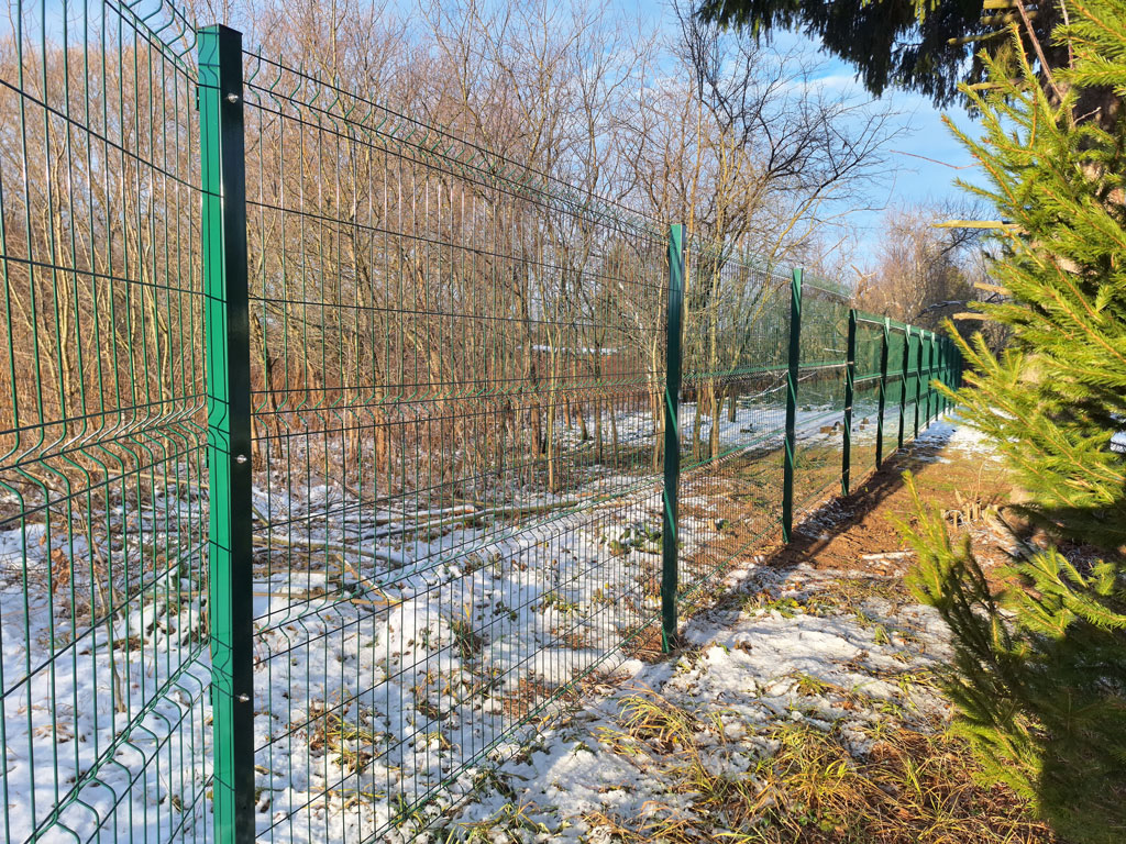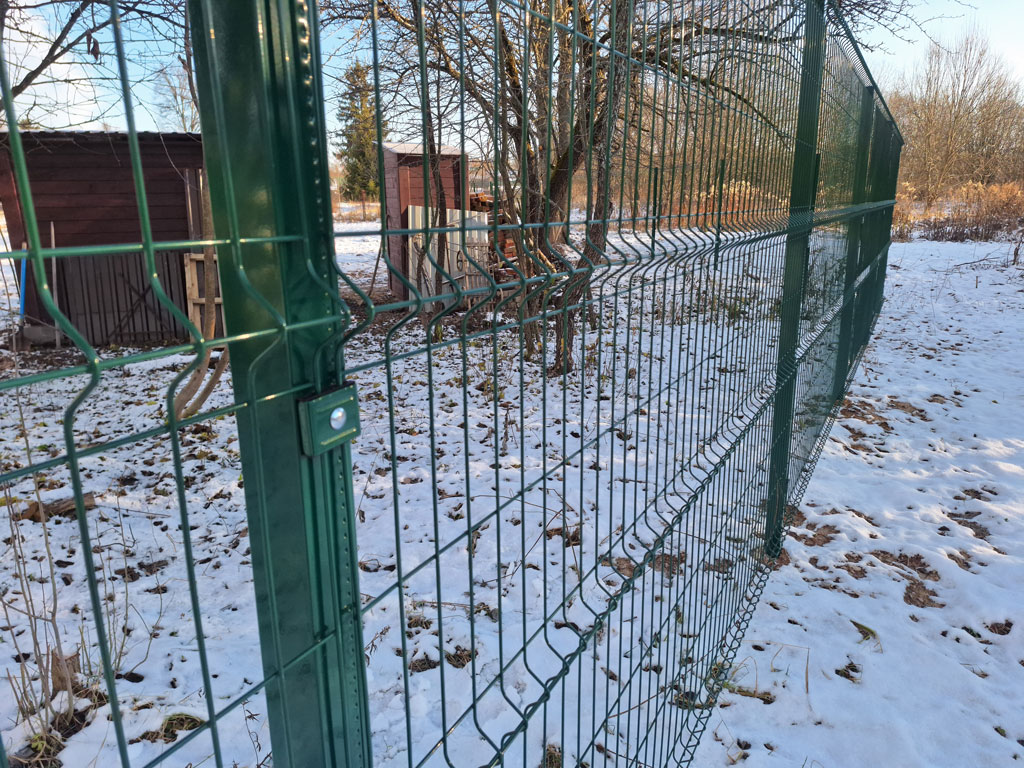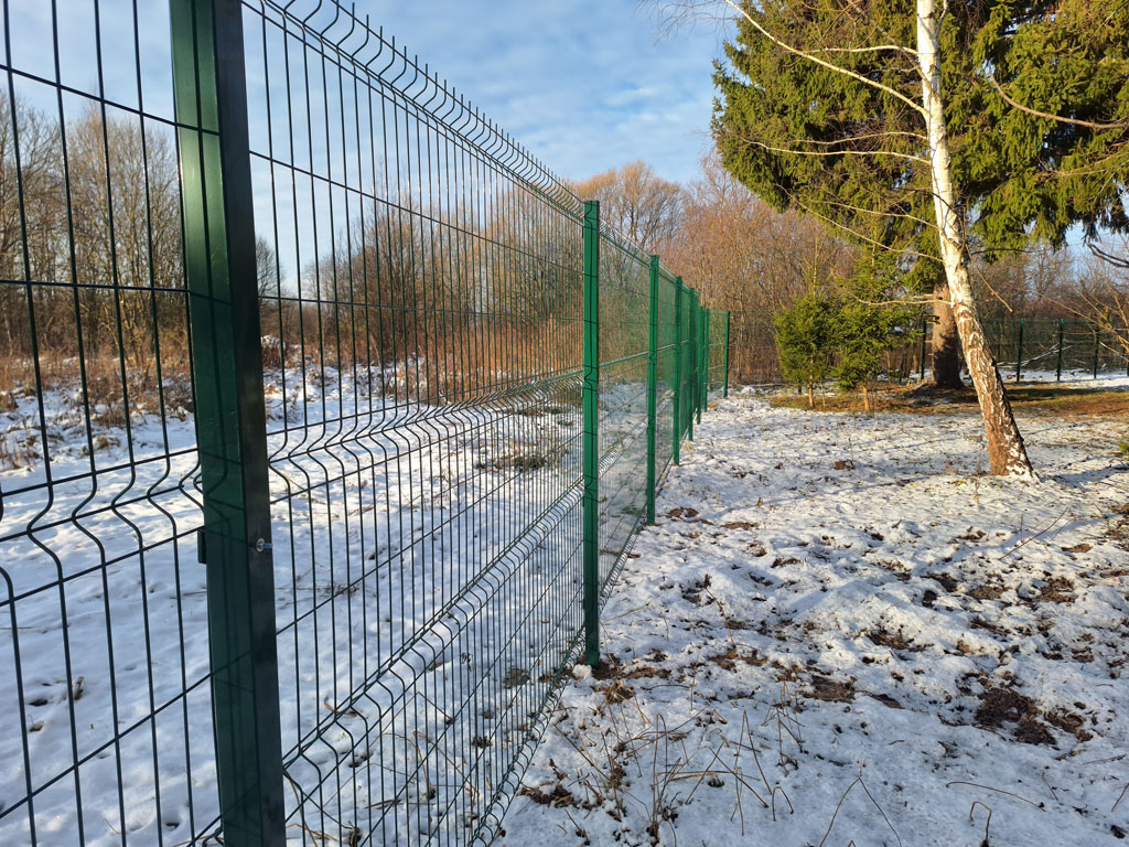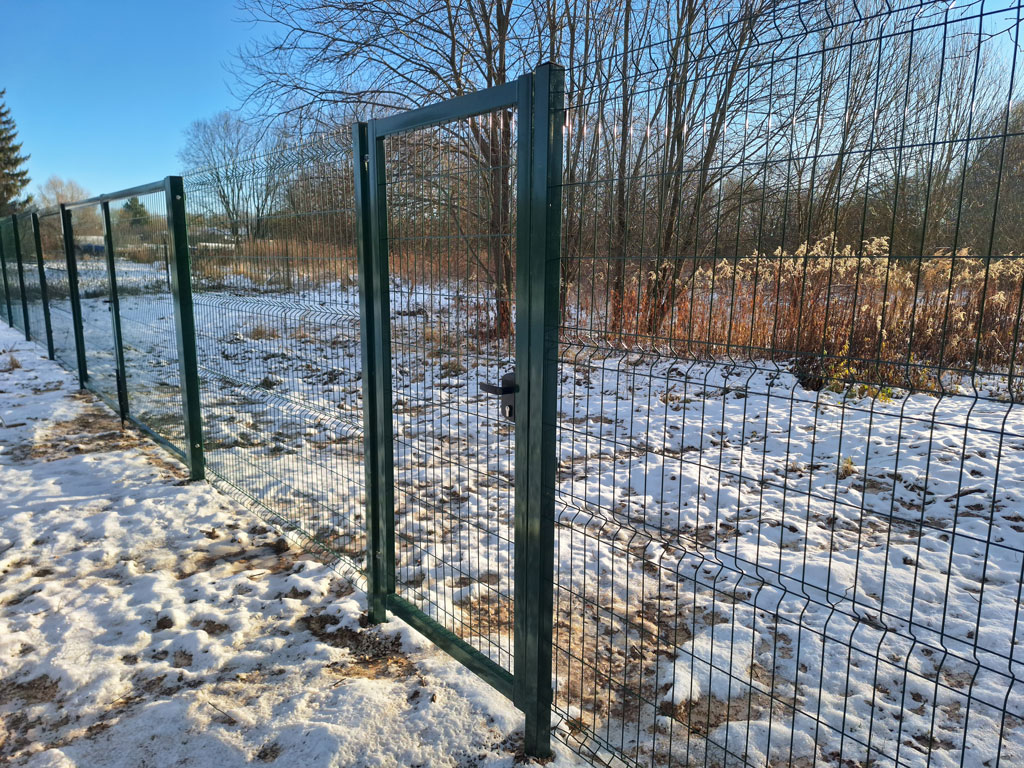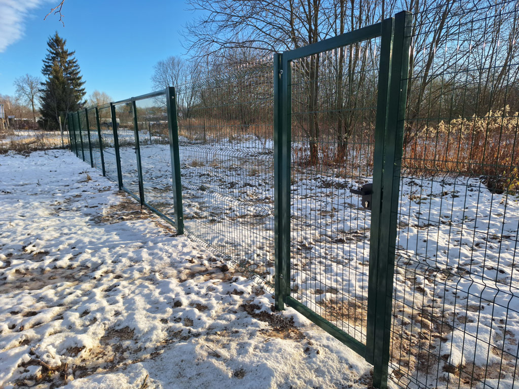 Произведён монтаж забора из 3D сетки от производителя «Grand Line». Общая длина забора 89 погонных метров при высоте 2 метра. Забор состоит из 36 секций смонтированных на 37 столбов. Столбы установлены в землю методом бутования на щебень. Глубина установки столбов 1,2 метра. Вместе с забором смонтированы распашные ворота и калитка из 3D сетки серии «Медиум». Размер ворот 4000х2000 мм. Размер калитки 2000х1000 мм. Калитка и ворота оборудованы заводскими механизмами закрывания.