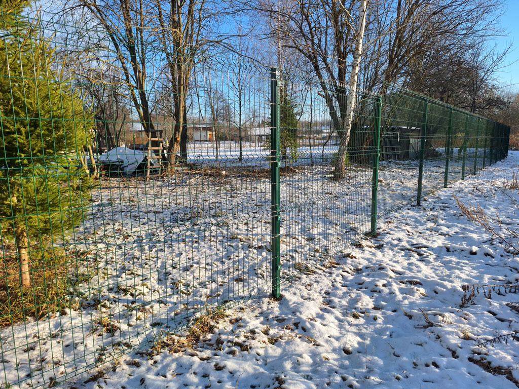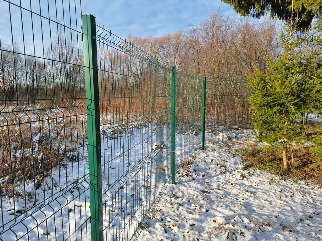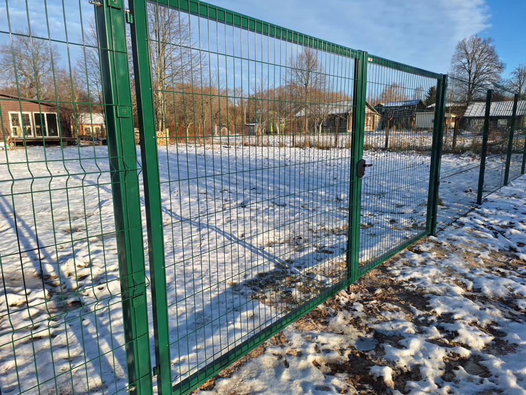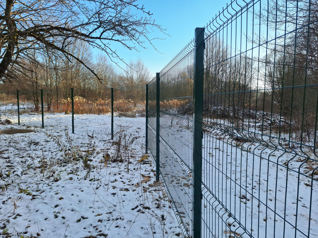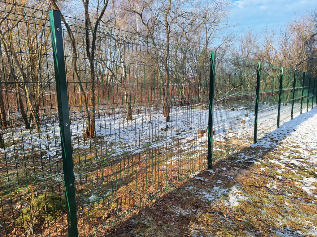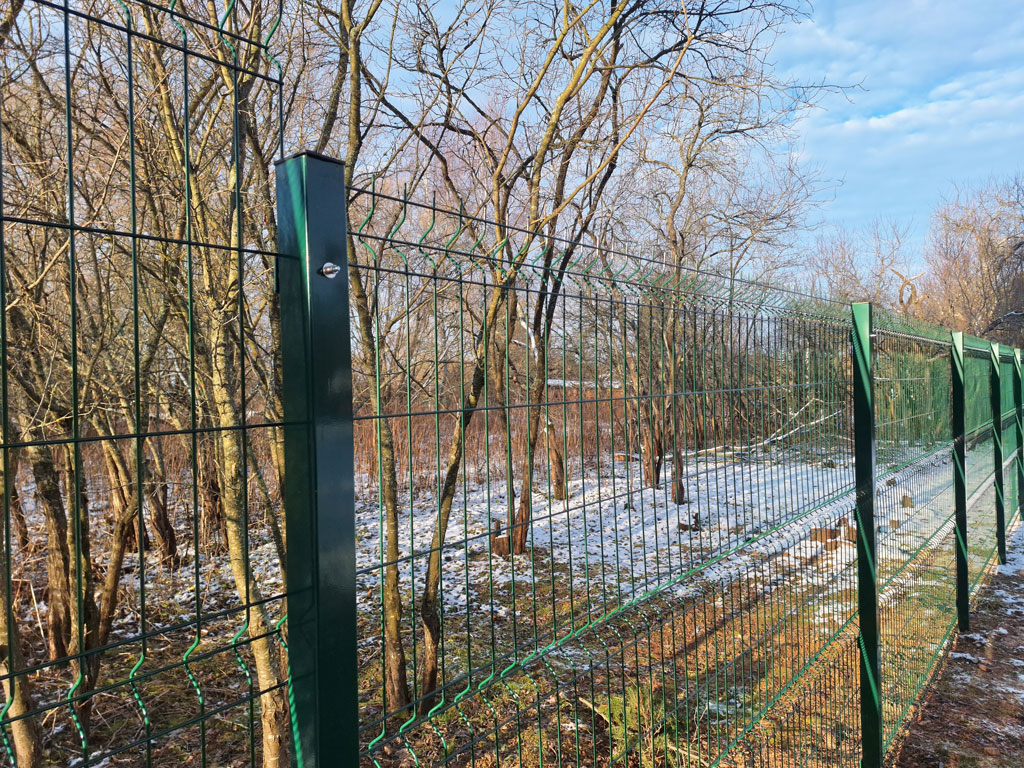 Произведён монтаж забора из 3D сетки от производителя «Grand Line». Общая длина забора 89 погонных метров при высоте 2 метра. Забор состоит из 36 секций смонтированных на 37 столбов. Столбы установлены в землю методом бутования на щебень. Глубина установки столбов 1,2 метра. Вместе с забором смонтированы распашные ворота и калитка из 3D сетки серии «Медиум». Размер ворот 4000х2000 мм. Размер калитки 2000х1000 мм. Калитка и ворота оборудованы заводскими механизмами закрывания.